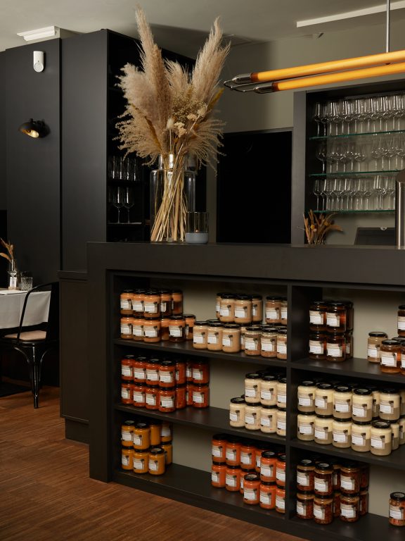 The corporate design of the current Bistro Trüffelschwein reflects the high standards of the cuisine, the atmosphere and the ambience in all elements and the choice of materials and finishes. The color concept is inspired by the truffle itself, complemented by contemporary color accents that complete the unique design. The interior concept was realized by Studio Oeding in collaboration with Studio Istland. It invites with a bistro ambience and convinces with the literally striking design of the culinary awards of the chef, the team and the operators together with many consistent and consistent details.
