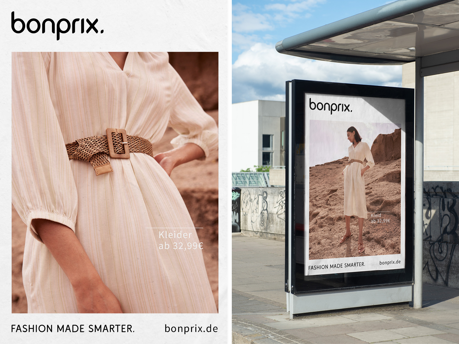 Studio Oeding then translated the strategy into a holistic corporate design. The positioning as a passionate, inspiring, authentic and smart brand has been visible in all branding disciplines since March 2023. Distinctive components are the logo, the individually developed brand font (spring ribbon) and the brand claim “Fashion made smarter” together with the visual identity and the changed color concept. bonprix is thus ready for the smart shopping experience of tomorrow in all channels.