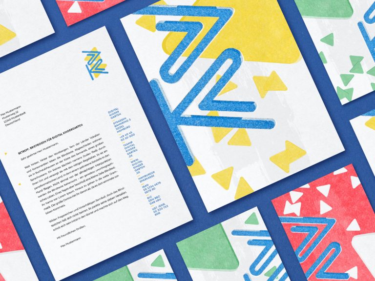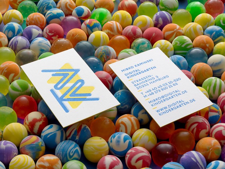 The essence of Digital Kindergarten is embedded in every detail of the design. Studio Oeding created a unique typeface and logo design inspired by coding and HTML brackets, blending them with playful ease, bold visuals, and a striking color palette. As a tribute to the early digital era, all print materials were produced using the Risograph printingtechnique, developed in Japan in 1986—the first digital printing method. The natural “bugs” of this process, such as slight misalignments and varying color applications, make each business card a one-of-a-kind piece. Another distinctive feature is the exclusive use of soy-based inks, reinforcing the sustainable approach of the design.