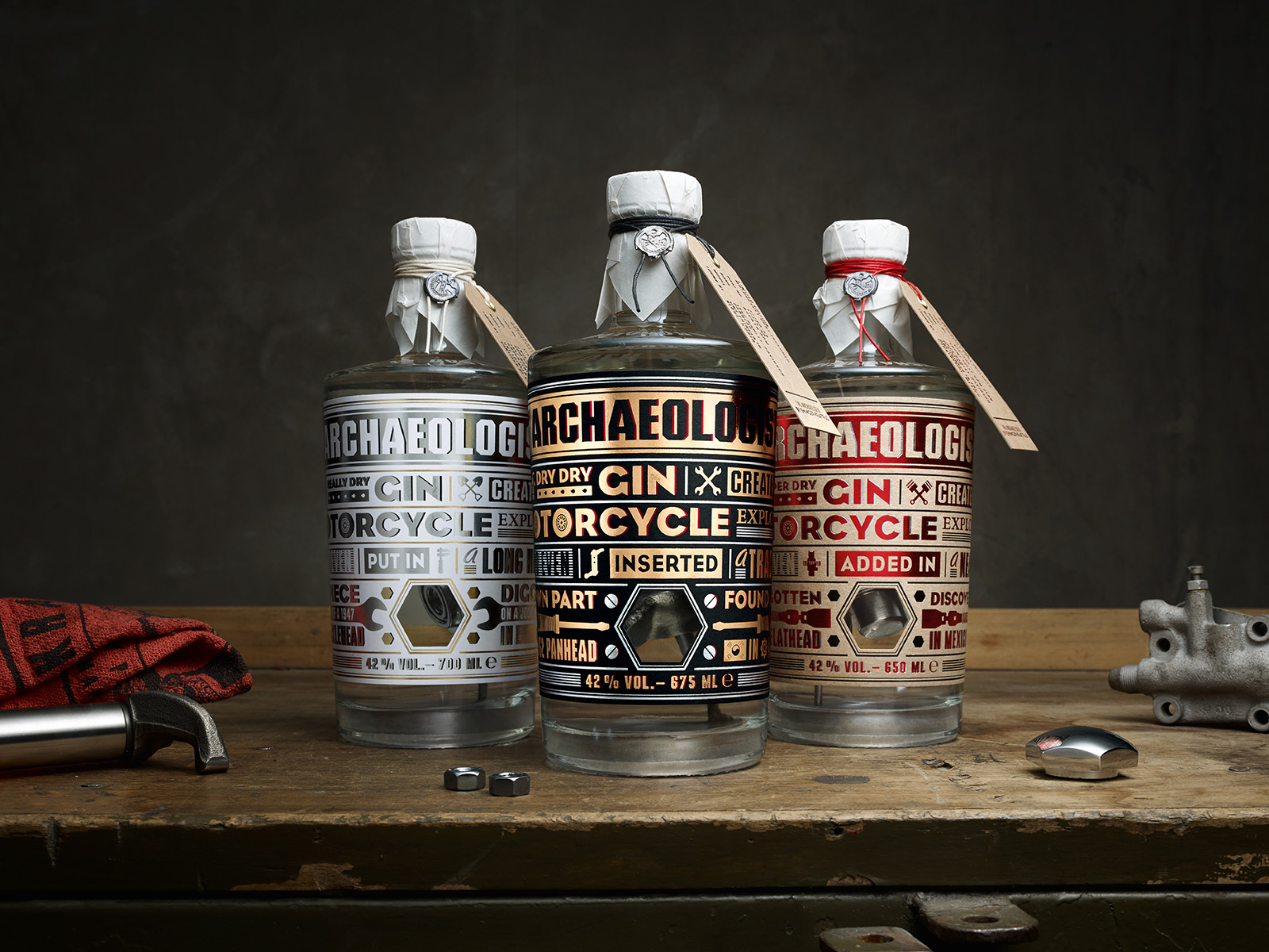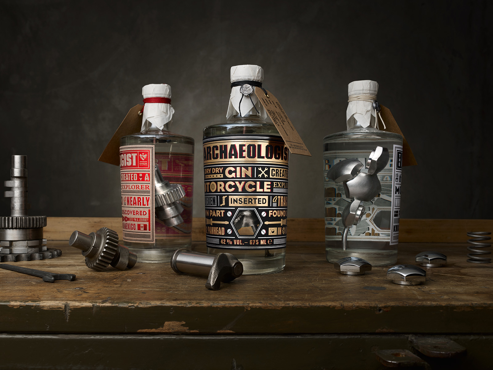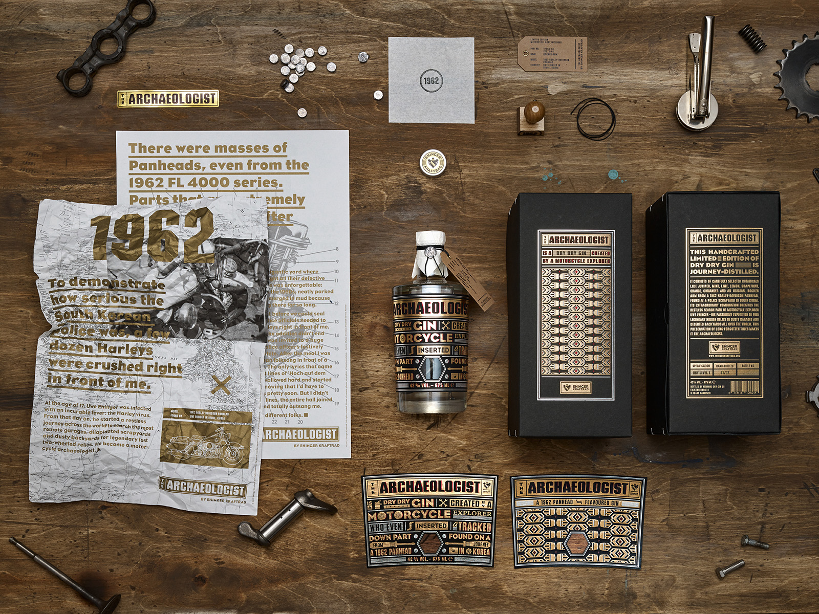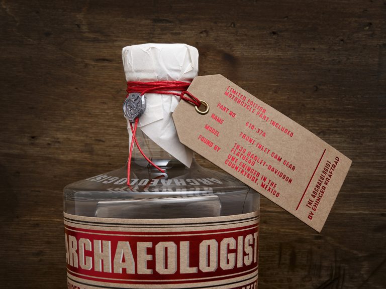 The product and packaging design of the premium dry gin “The Archaeologist” is the first spirit of its kind worldwide. It is bottled in flasks containing original engine parts from legendary Harley-Davidson motorcycles—parts that motorcycle archaeologist Uwe Ehinger has unearthed from around the world. 1939 Flathead camshafts from the Mexican desert, 1947 Knucklehead nuts from Chile, 1962 Panhead rocker arms from South Korea—each of these iconic machines is honored with its own edition of this unique tribute drink.