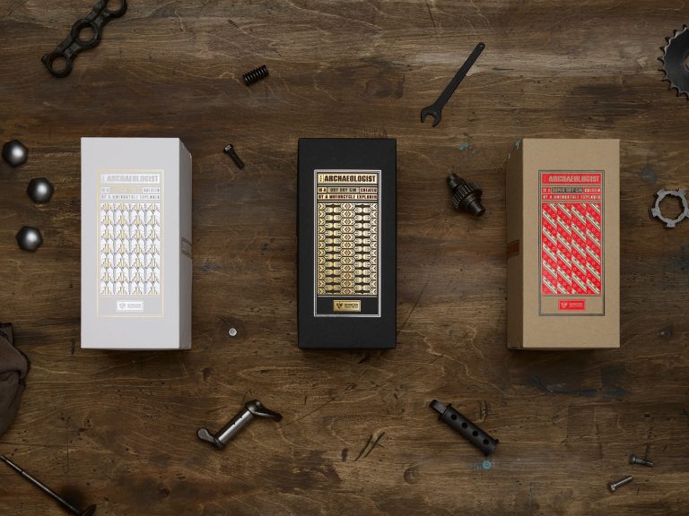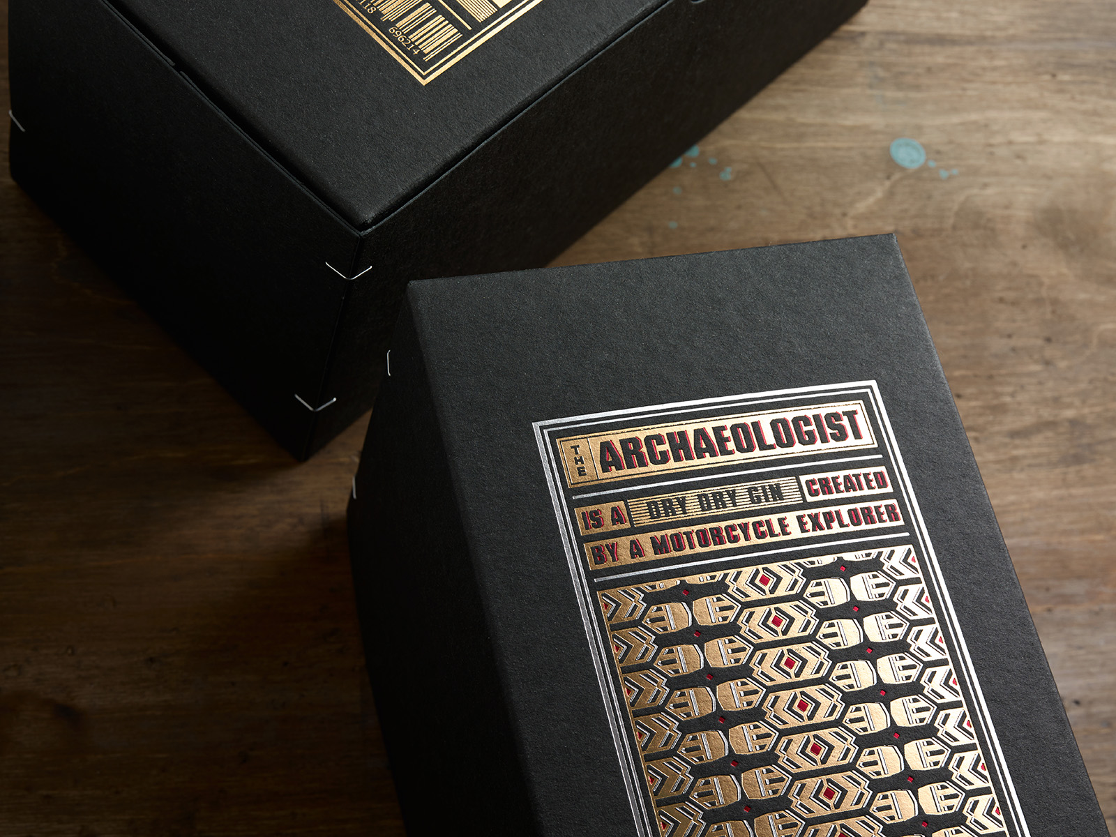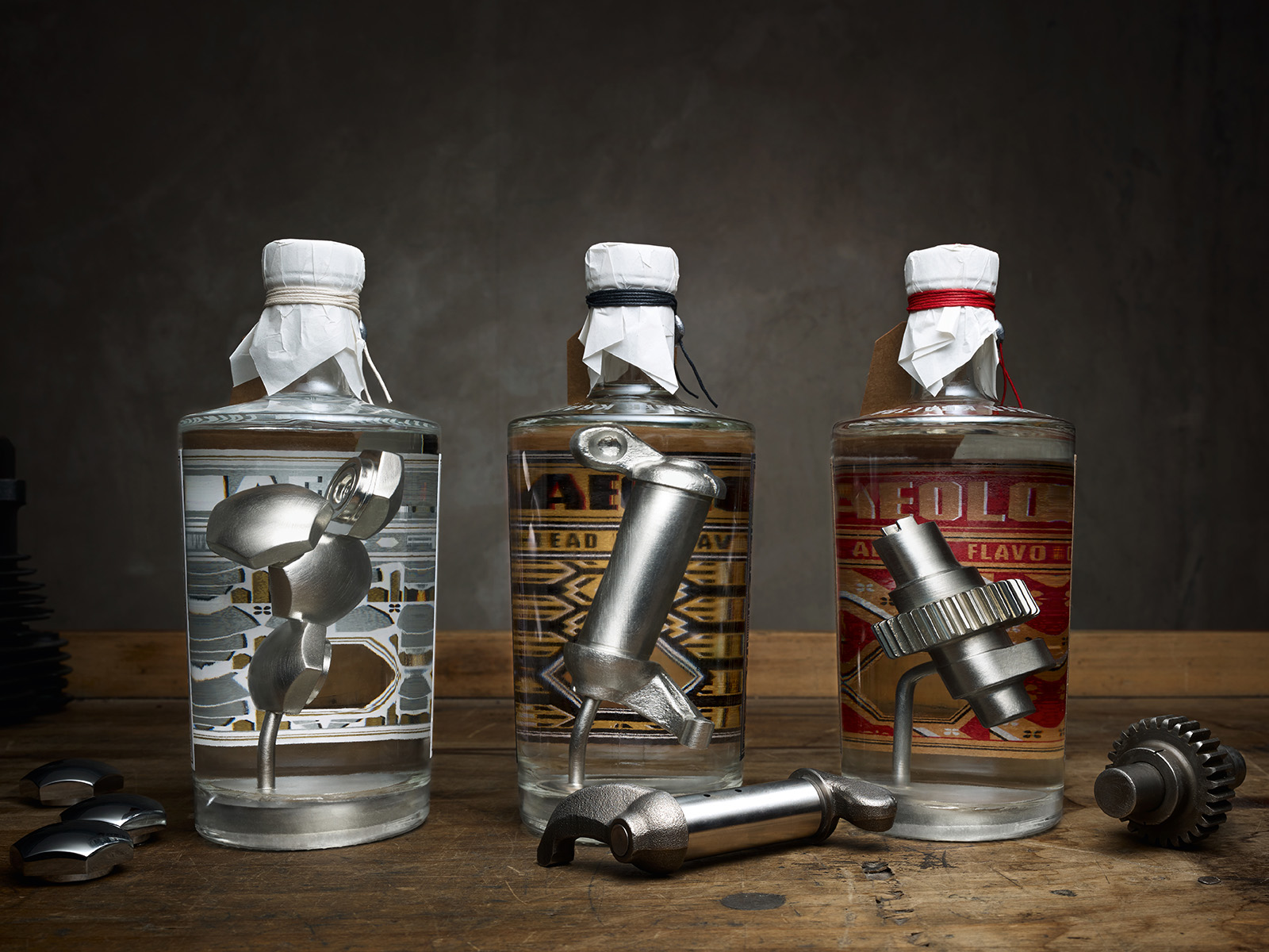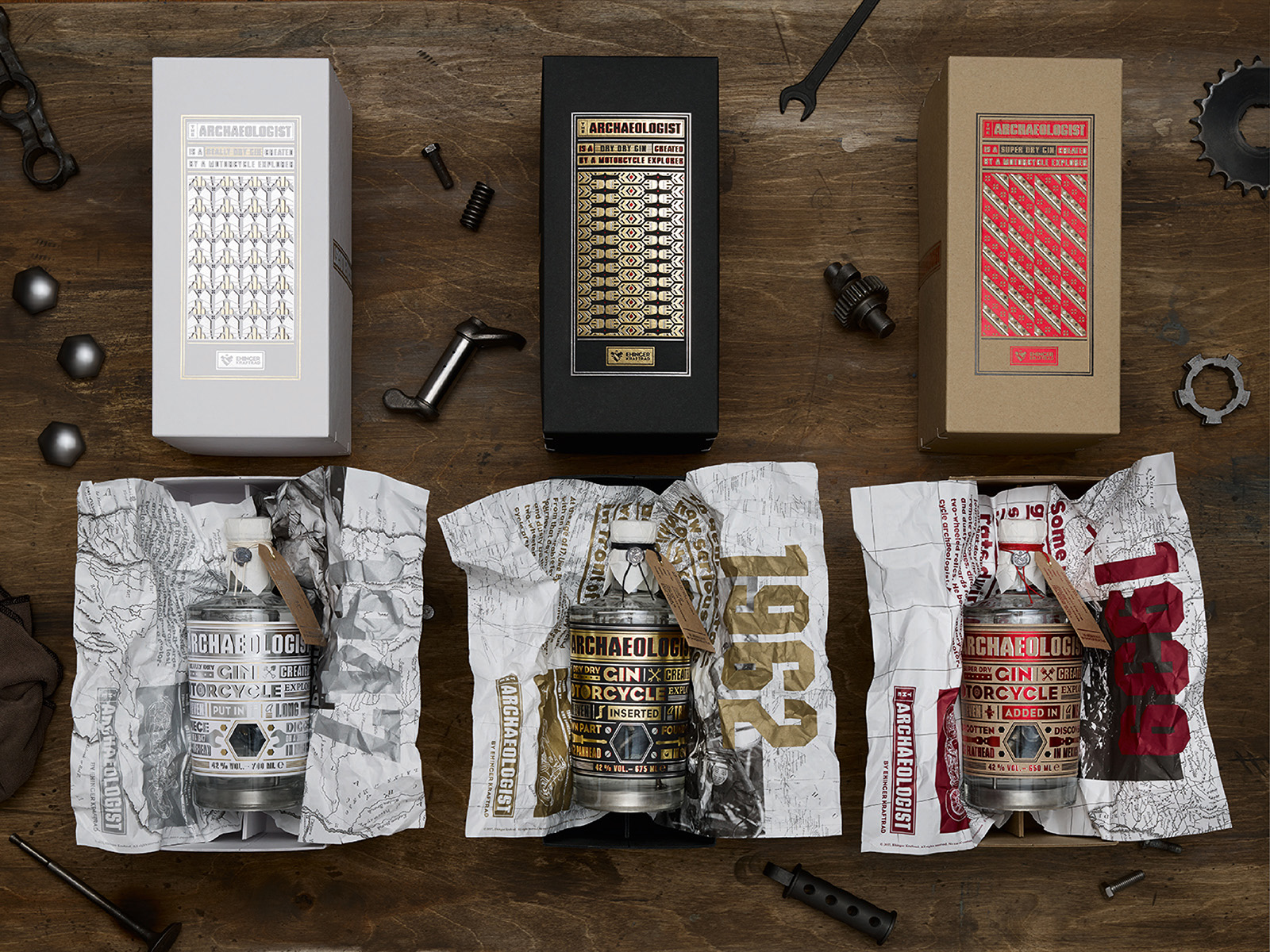 The product and packaging design of the premium dry gin “The Archaeologist” is the first spirit of its kind worldwide. It is bottled in flasks containing original engine parts from legendary Harley-Davidson motorcycles—parts that motorcycle archaeologist Uwe Ehinger has unearthed from around the world. 1939 Flathead camshafts from the Mexican desert, 1947 Knucklehead nuts from Chile, 1962 Panhead rocker arms from South Korea—each of these iconic machines is honored with its own edition of this unique tribute drink.