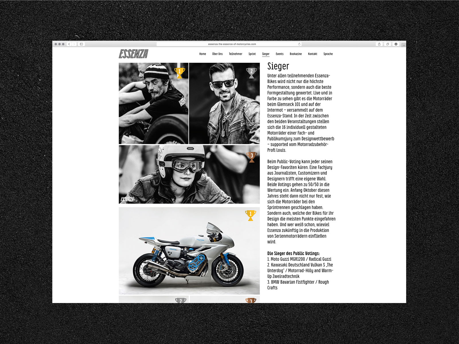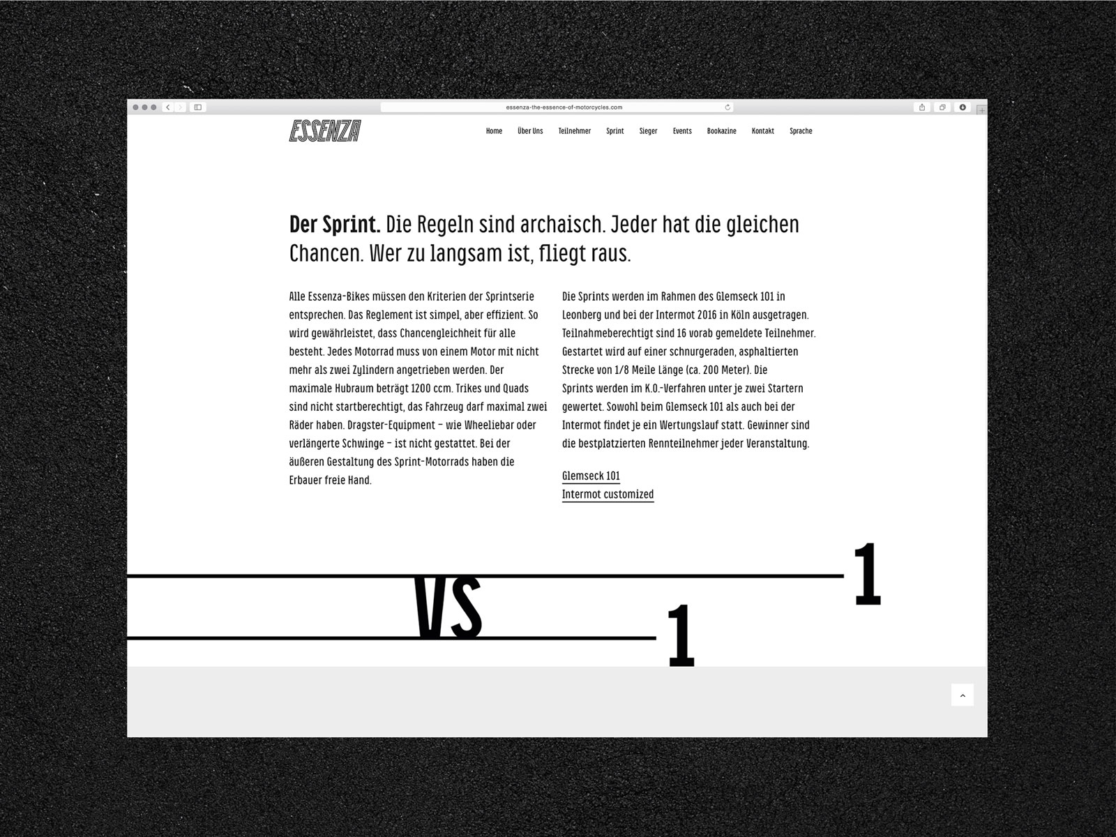 The innovative motorcycle sprint series, launched in 2016 with its own design competition, brought international motorcycle manufacturers and riders to the racetrack. Sixteen racing teams compete in a knockout system. The foundation of the logo consists of 16 lines, symbolizing the 16 sprint participants. The “E” represents the starting lines for the two competitors in each race. The corporate design visualizes speed across all its media.