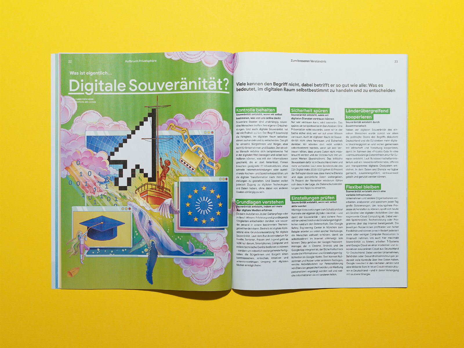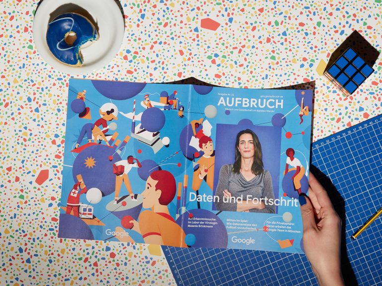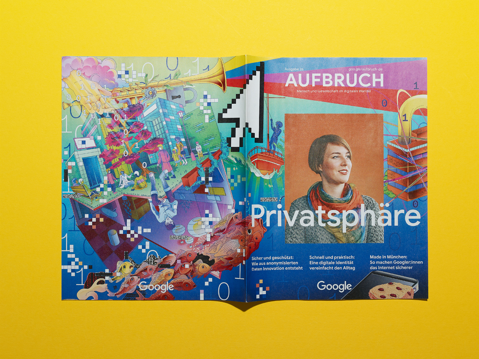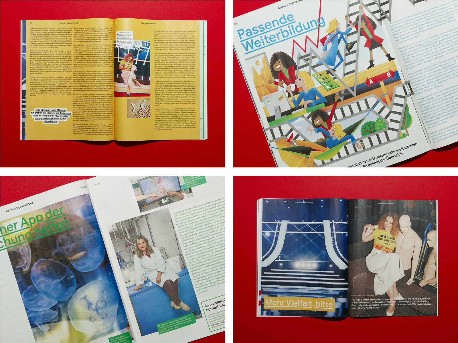 The editorial design was given a contemporary and inspiring design rework to present innovative stories, versatile portraits and helpful background information in a contemporary and motivating way. Changing collaborations with illustrators and photographers round off the transformation of Google Aufbruch magazine. The aim of each issue is to provide millions of readers with exciting access to the digital transformation of our society, economy and politics in an entertaining and informative way.