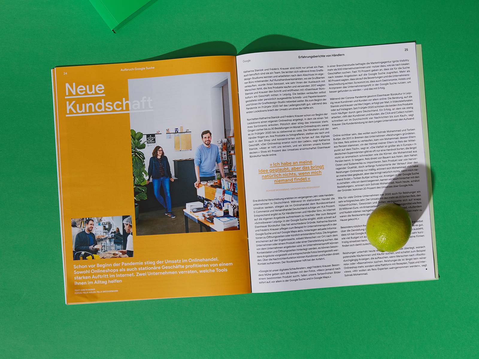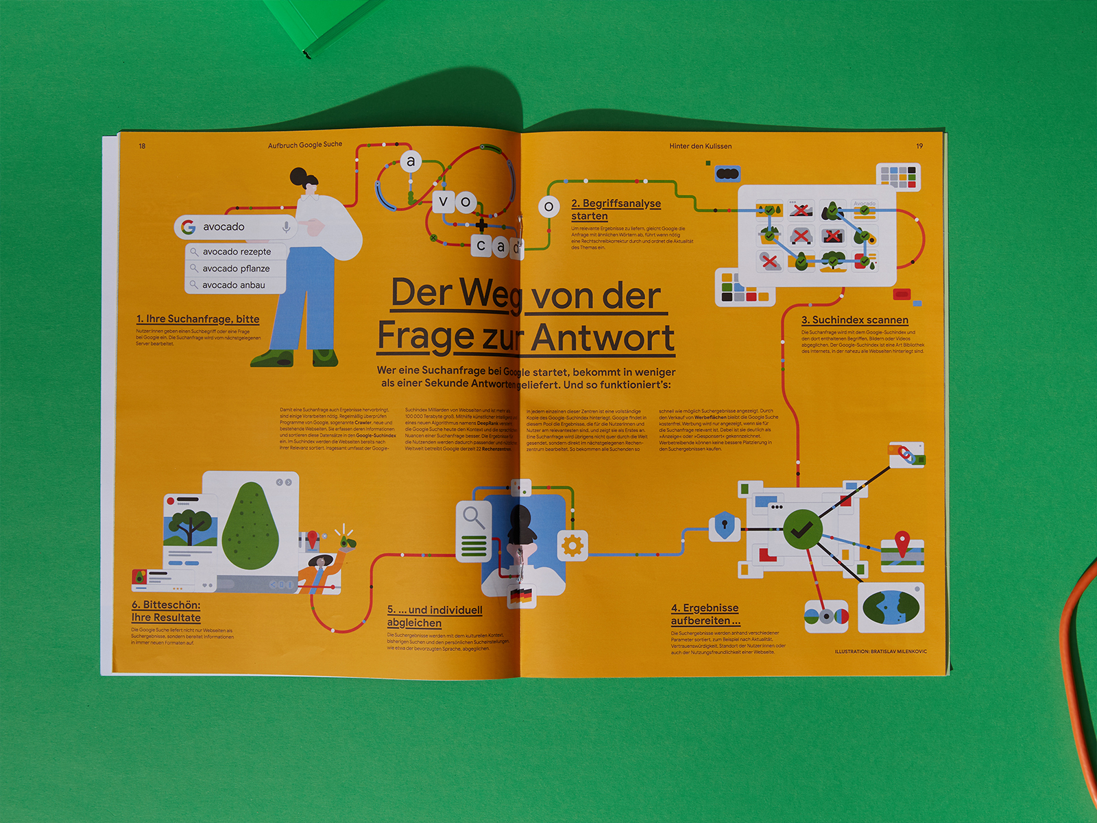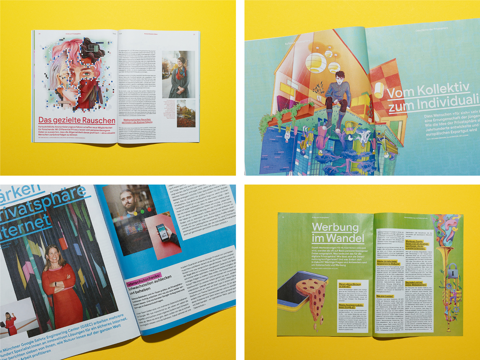 The editorial design was given a contemporary and inspiring design rework to present innovative stories, versatile portraits and helpful background information in a contemporary and motivating way. Changing collaborations with illustrators and photographers round off the transformation of Google Aufbruch magazine. The aim of each issue is to provide millions of readers with exciting access to the digital transformation of our society, economy and politics in an entertaining and informative way.