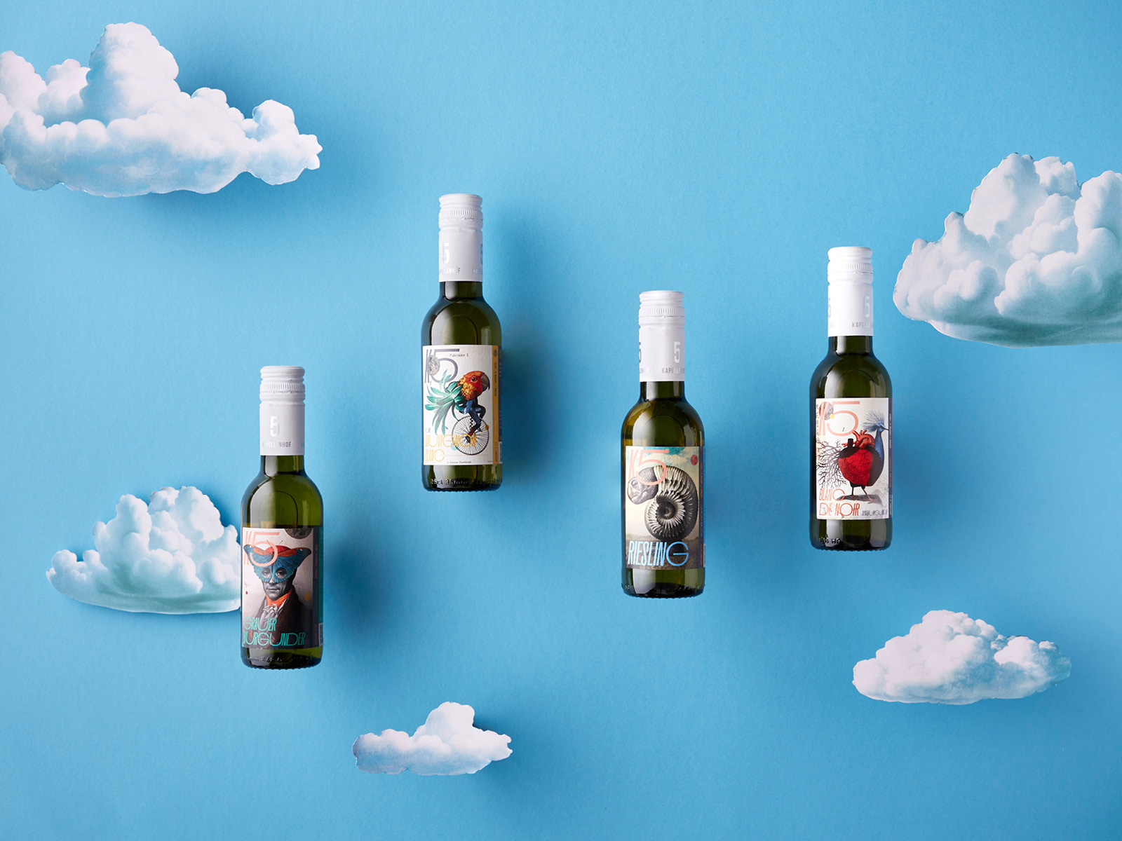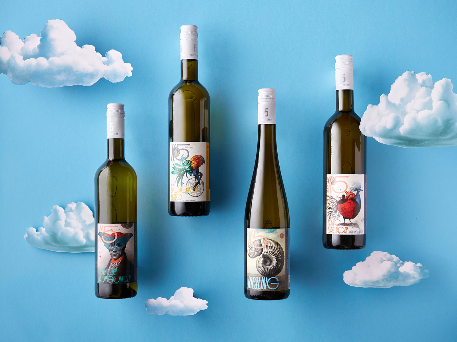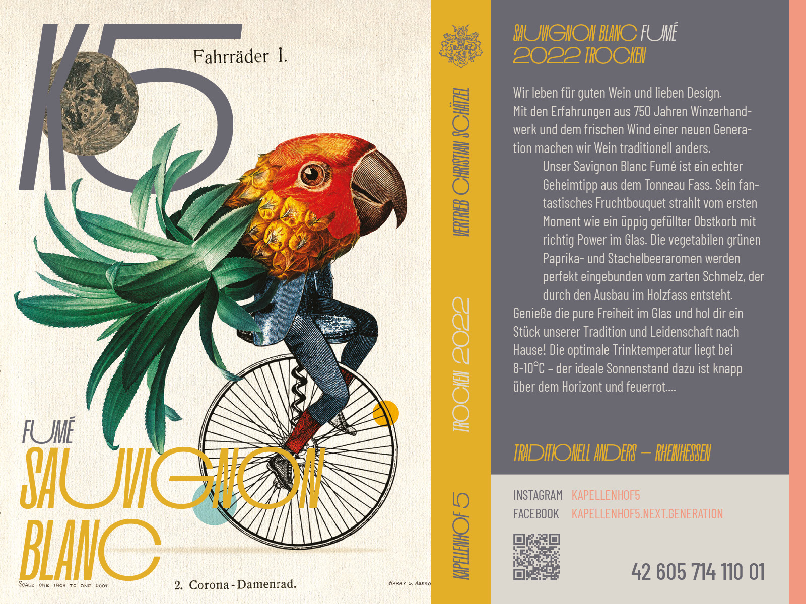 capture the viewer’s attention. The chosen colors are bold and positive, the illustrations are based on editions of previous generations of the Kapellenhof. The third component is humor, which is expressed with entertaining illustrations and unexpected image compositions that make everyone stop at the wine rack.