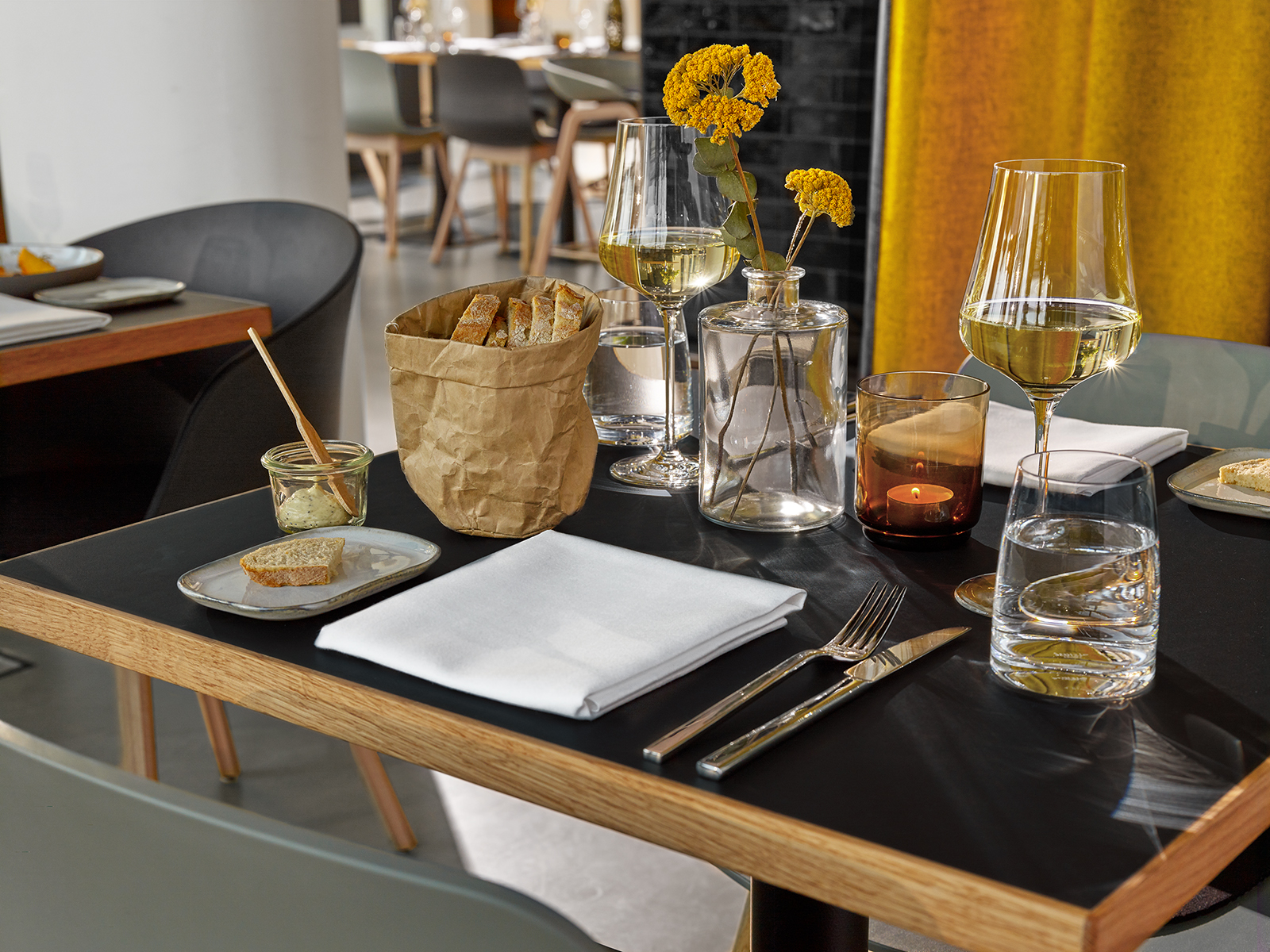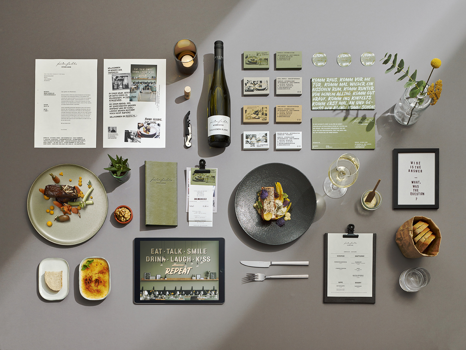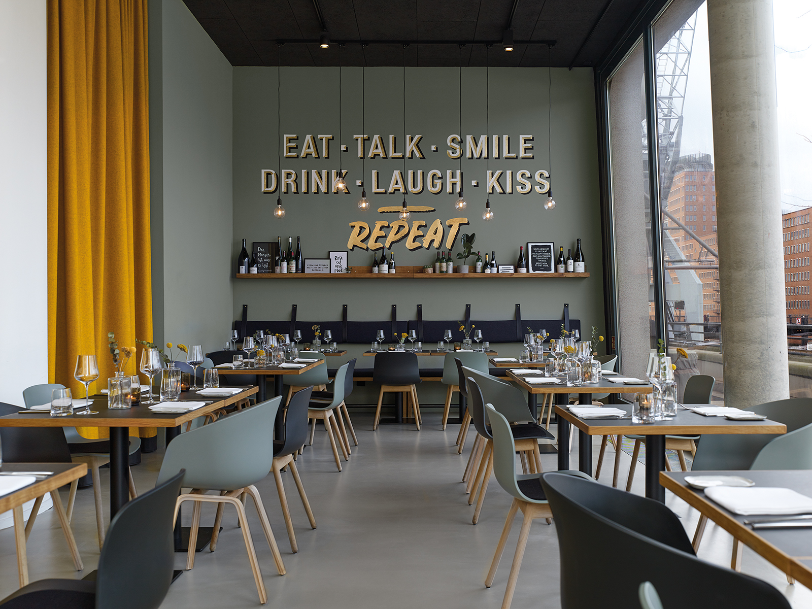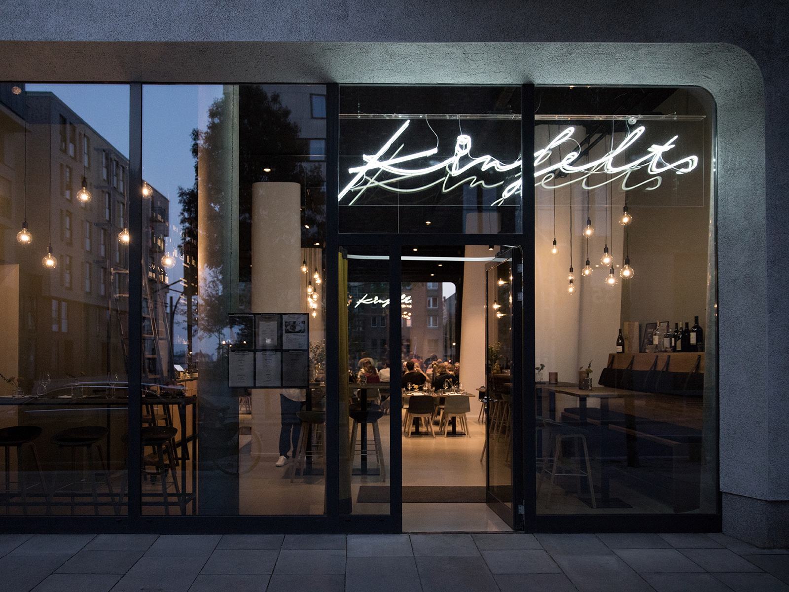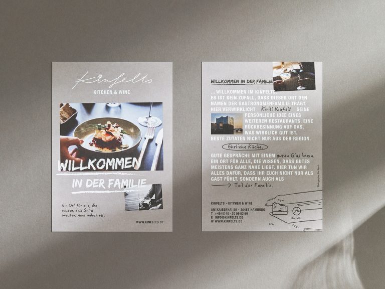 “Welcome to the family” is the guiding concept behind the second restaurant of Michelin-starred chef Kirill Kinfelt. At Kinfelts, elevated bistro cuisine and fine wines are served in a relaxed yet sophisticated setting for casual lunch and dining. The corporate design and urban interior concept embody the personal touch of the owners and the warm, family-like atmosphere in many unique ways.