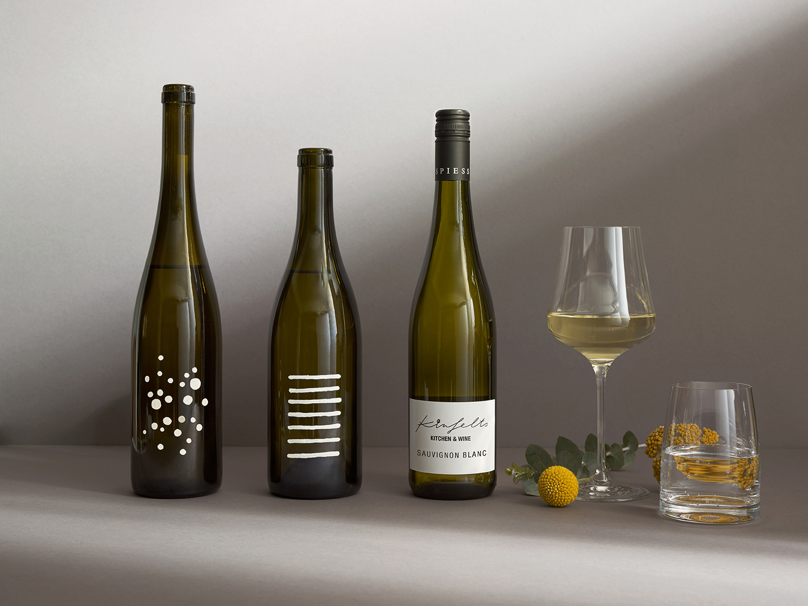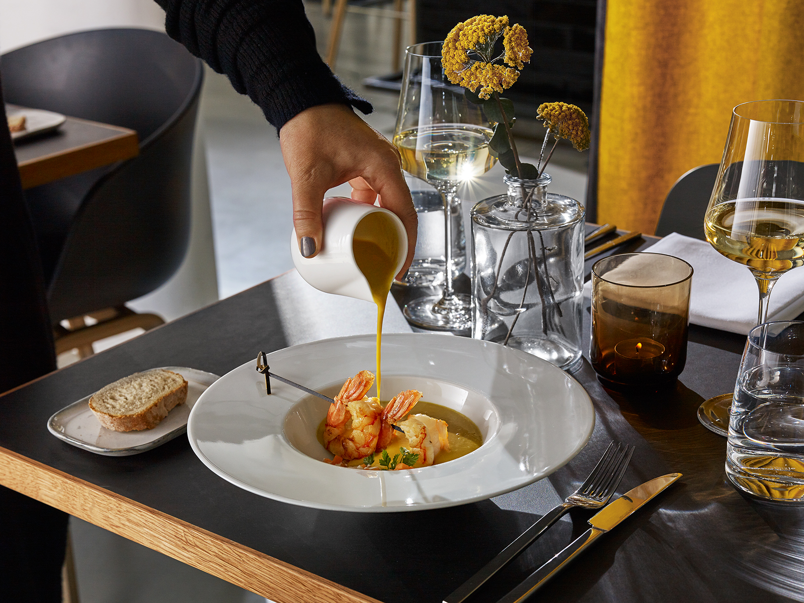Every element is thoughtfully selected: premium Fedrigoni dyed papers for all printed materials, custom-made furniture and fabrics, and high-quality tableware. Eucalyptus and Craspedia decorations naturally bring the color concept to each table. The striking floor-to-ceiling wine shelf, designed as a wine library housing over 200 varieties, reinforces the restaurant’s concept.