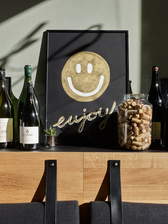 At the heart of the design is their passion—expressed through handcrafted details such as the logo, hand-stamped and calligraphed elements, including quotes about food and wine, and a large-scale shadow painting in the dining area. Inspired by natural eucalyptus and mustard tones, the interior details are carefully curated, harmonizing with white and stone-gray accents for a cohesive aesthetic.