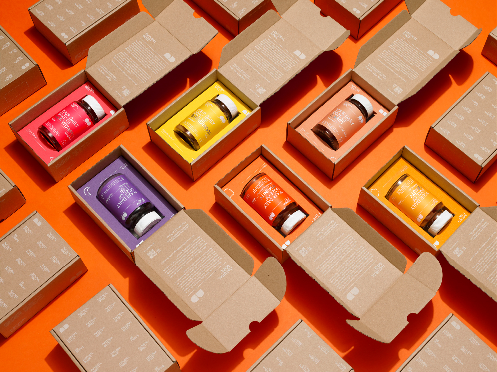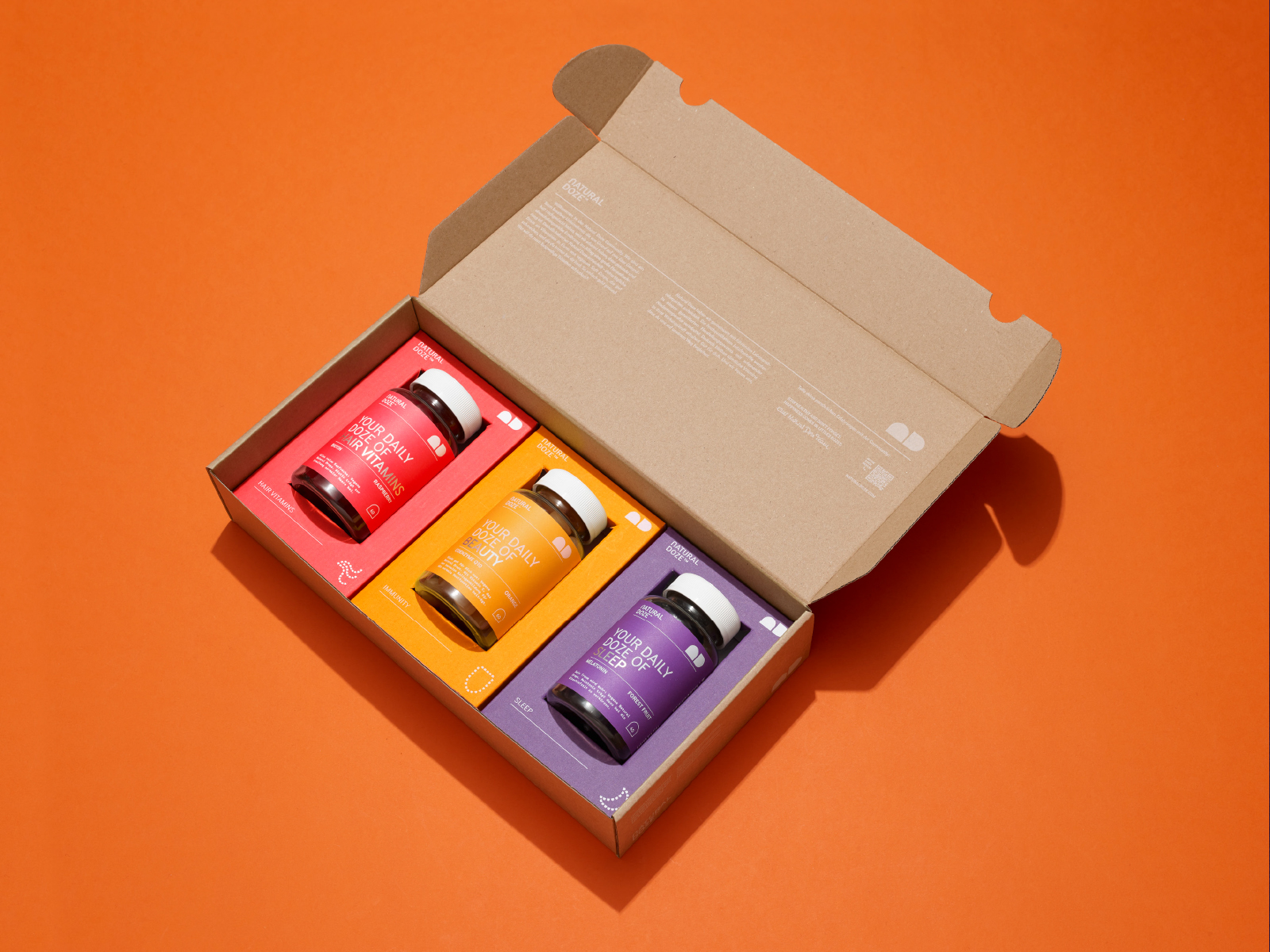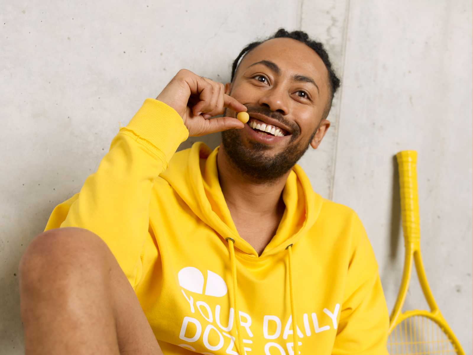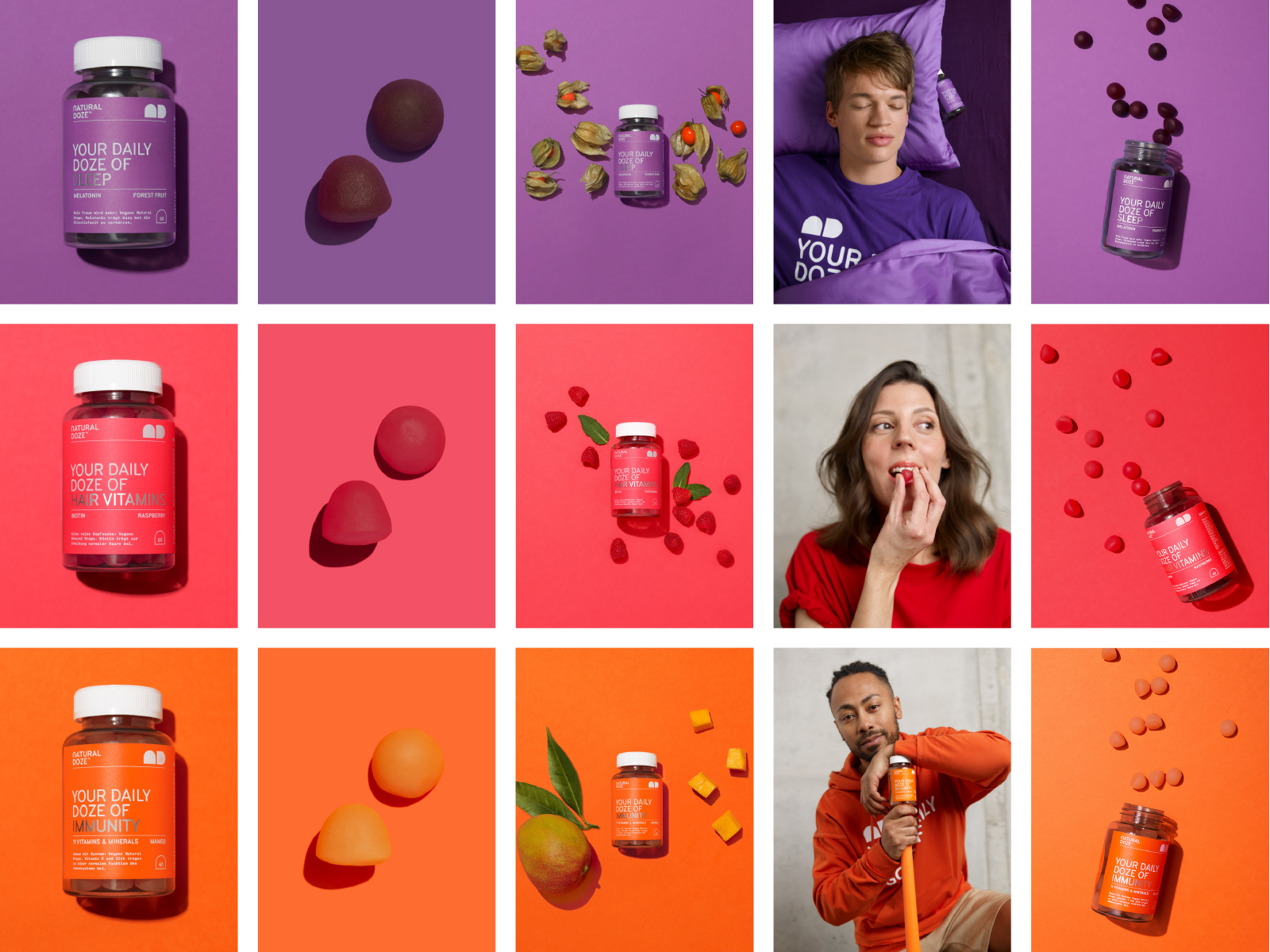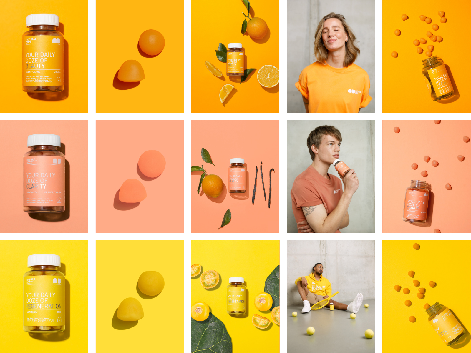 Sustainability, naturalness and liveliness were the key drivers behind the development of the identity and design of the supplements brand. Based on the jointly developed product range structure, which uses an intensive color code to create a classification system with clear variety differentiation. The color of the individual products is inspired by the respective fruit that provides the taste. The result is a fresh, bright and optimistic world of colour that visualizes a positive attitude to life. This cheerfulness is also reflected in the unmistakable word-image brand with gum shape, interface design and communication.