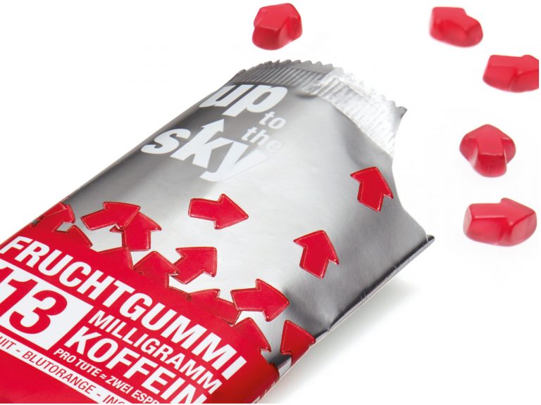 Up to the sky is an innovation on the candy market as the fruit gum with natural caffeine is only for adults. The packaging concept visualizes the flavor-differentiation by color and the dosage with a caffeine scale. We designed the energizing fruit gums for adults in an arrow shape to make the effect of the product clear at a glance.
