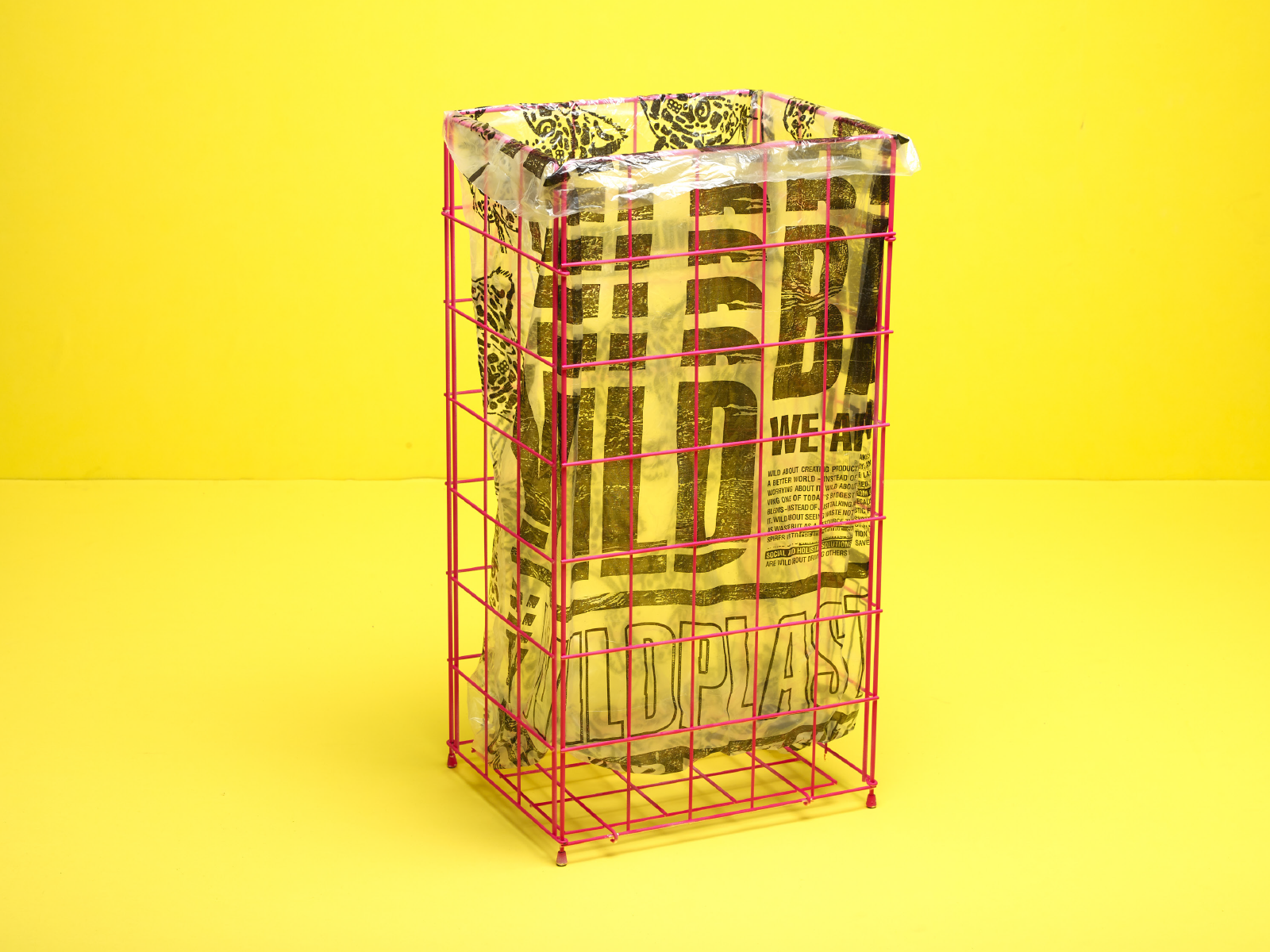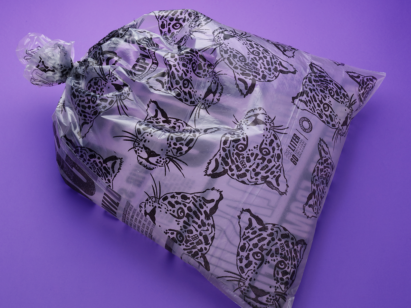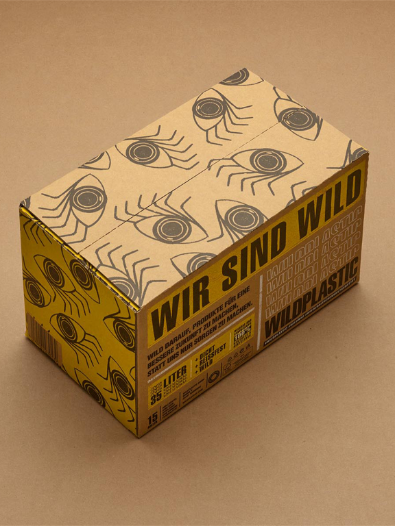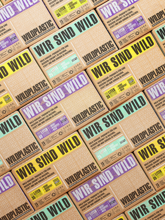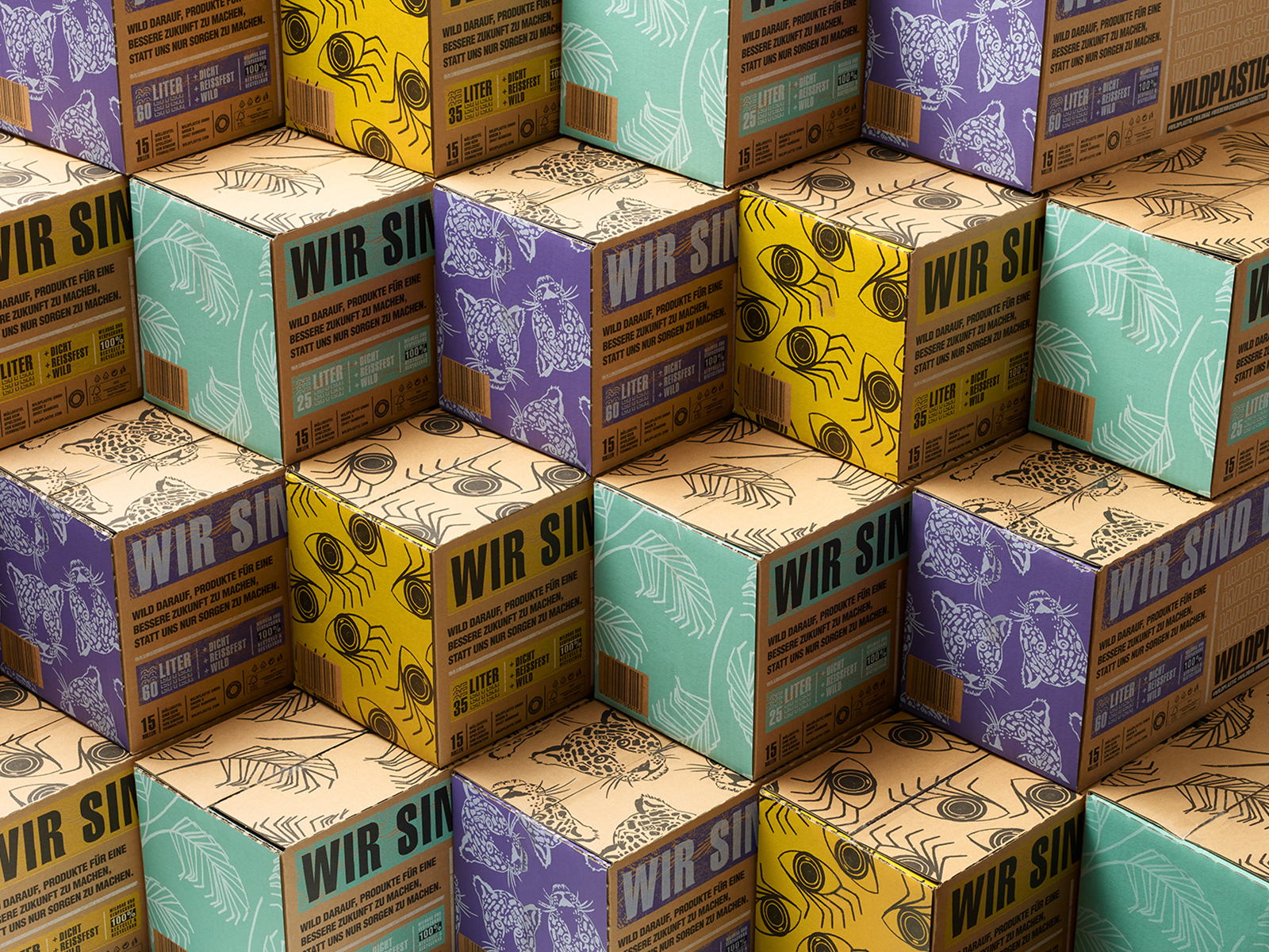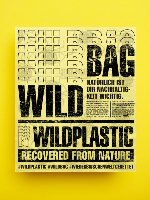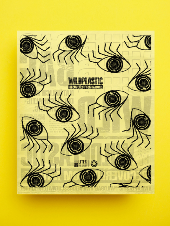 To design our WILDBAGs, we painted plastic products with paint, then printed them and digitized the print. That’s why the black color is not completely opaque, but has a versatile structure. Everything we do is BOLD, LOUD and WILD. We draw attention to one of the biggest problems of our time and the only way to do that is with a loud BOOM! Our texts, colors and images are WILD. The design of the WILDBAGs consists of eyes made up of Coffee-2-Go lids and straws. A leopard made from plastic utensils found on the beach and a palm leaf made from discarded straws. Visualized sins of our plastic consumption that now lie in nature. Our eyes are always on your garbage.