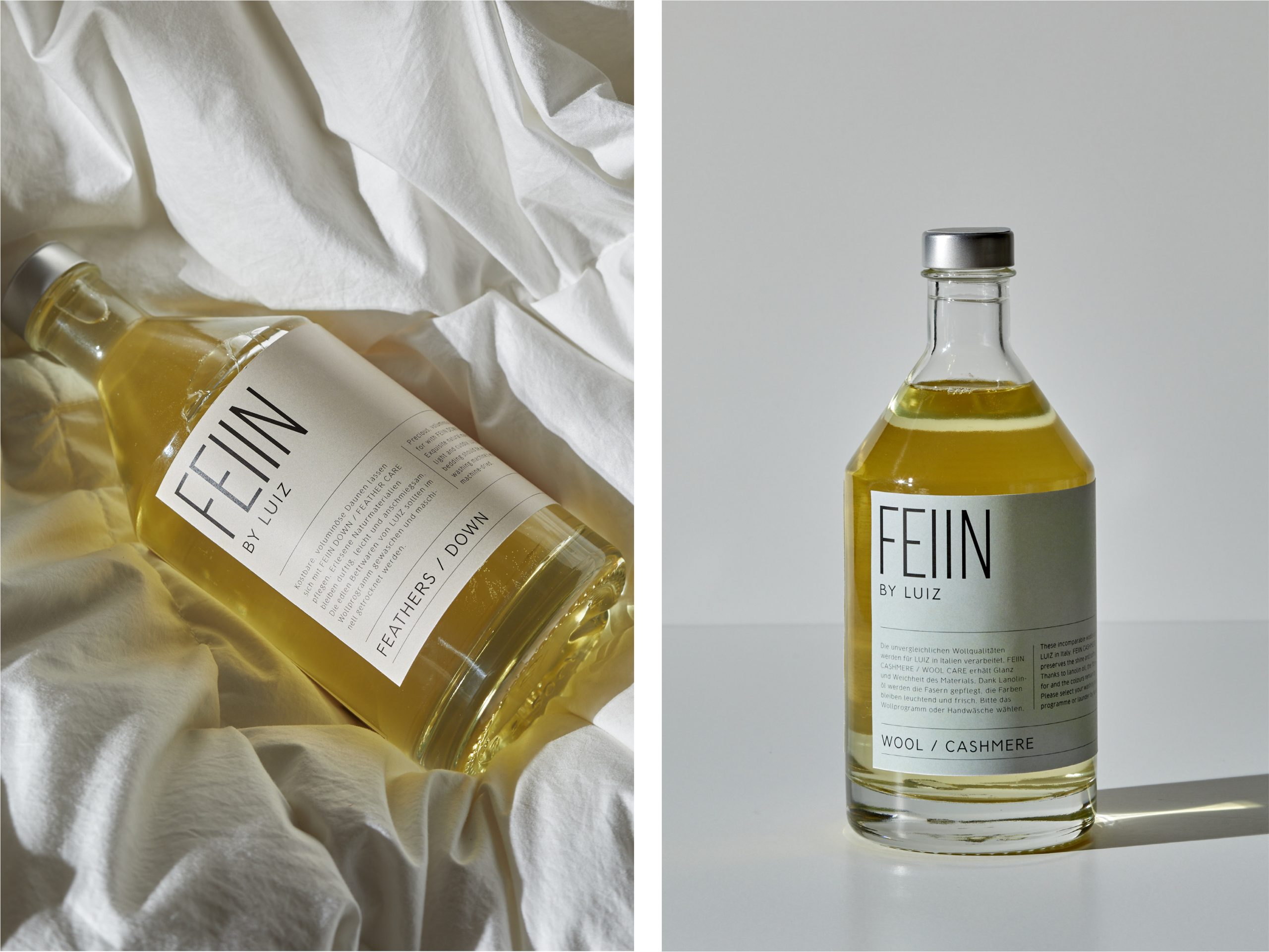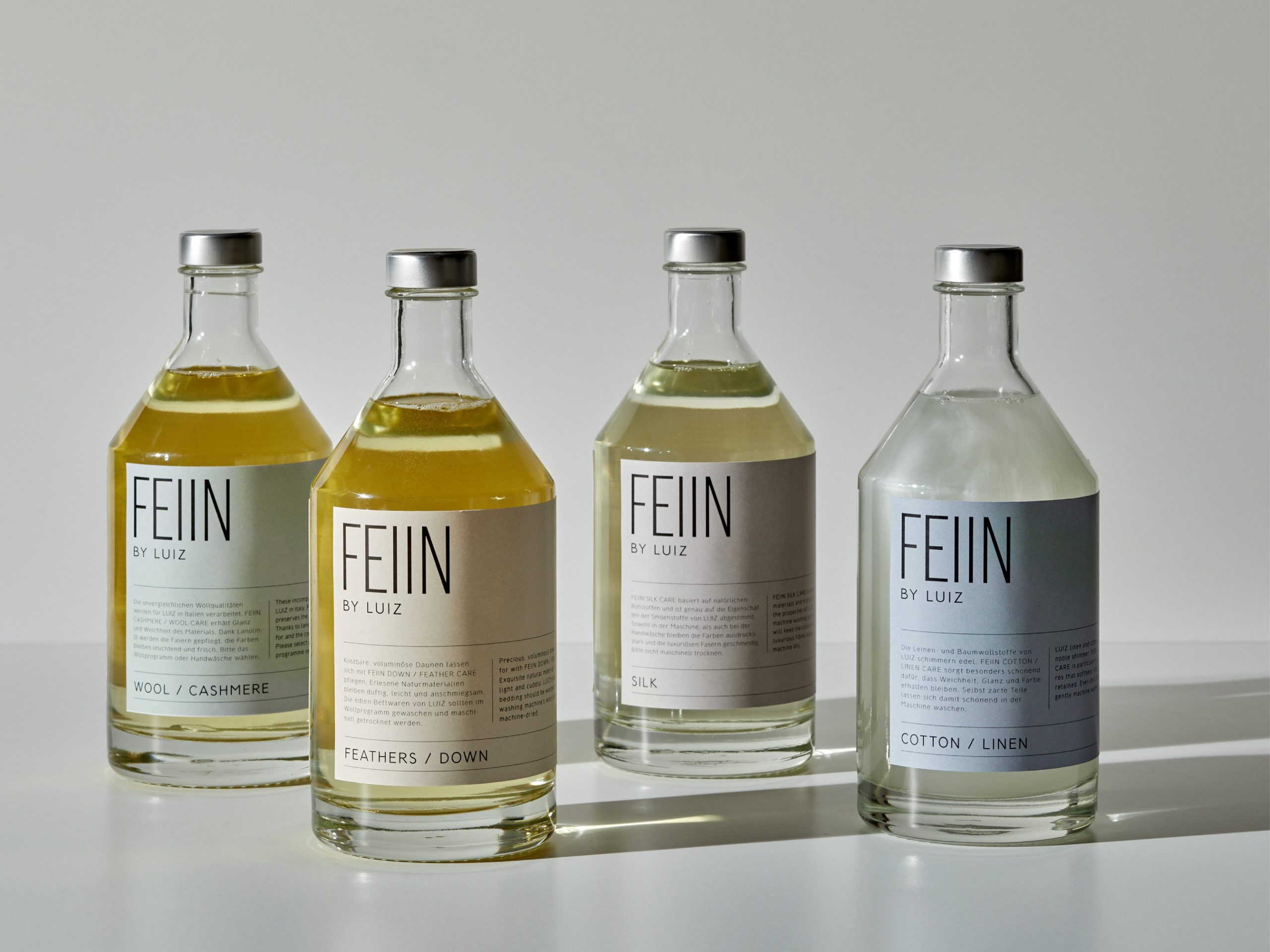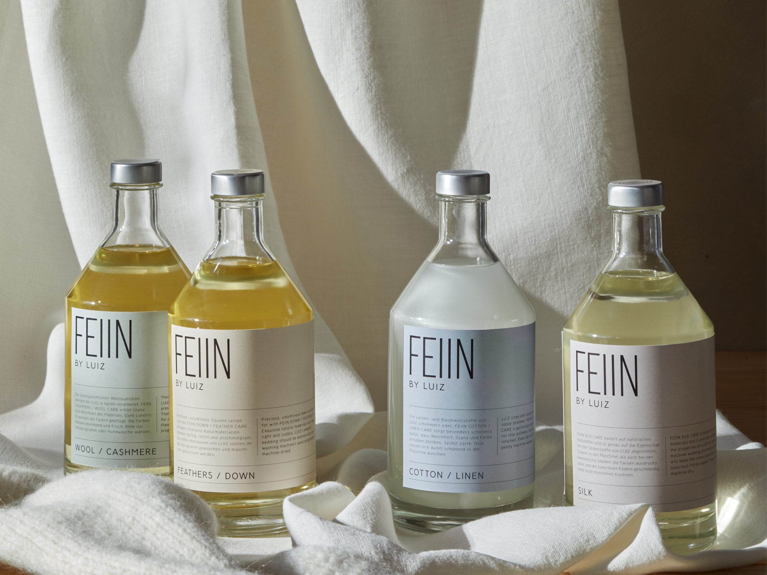 Das ebenfalls von Studio Oeding entworfene elegante Corporate Design der Marke war maßgeblich für das Designkonzept der Pflegeserie „FEIIN by LUIZ“. Die Produktserie ist in vier Sorten passend zu den Materialien der LUIZ Produkte, wie Wolle/Kaschmir, Seide, Daunen/Federn, Baumwolle/Leinen. Auf der kubistischen Glasflasche (10ml, 100 ml und 500ml) findet das Branding inkl. Gebrauchsanweisung Platz. Das Produktdesign spiegelt die Geradlinigkeit und die Eleganz der Marke auf FSC zertifiziertem Papier in pastelligen Naturtönen wider. Die Beschichtung des Etiketts macht es widerstandsfähig für die vielen Waschanwendungen.