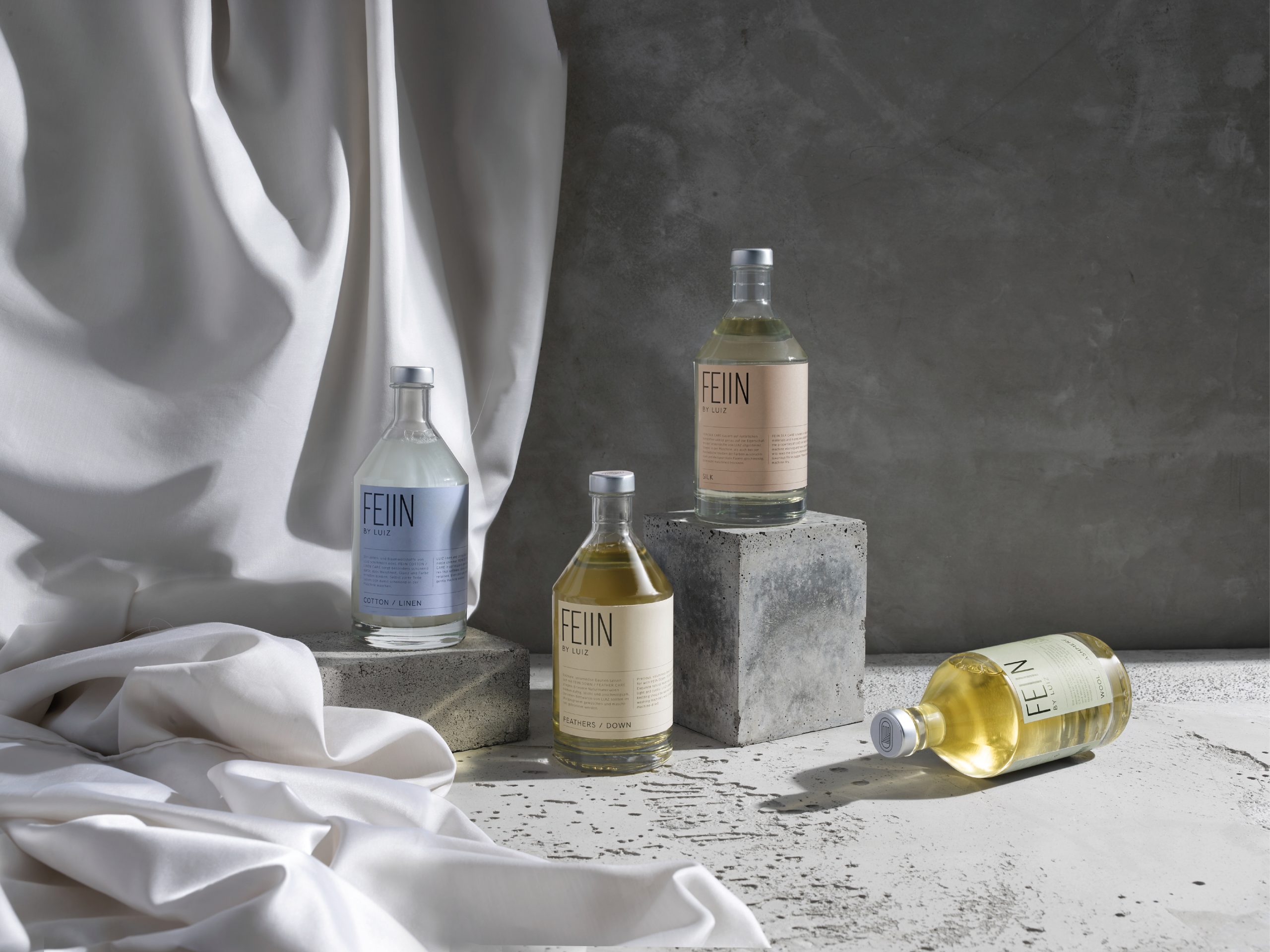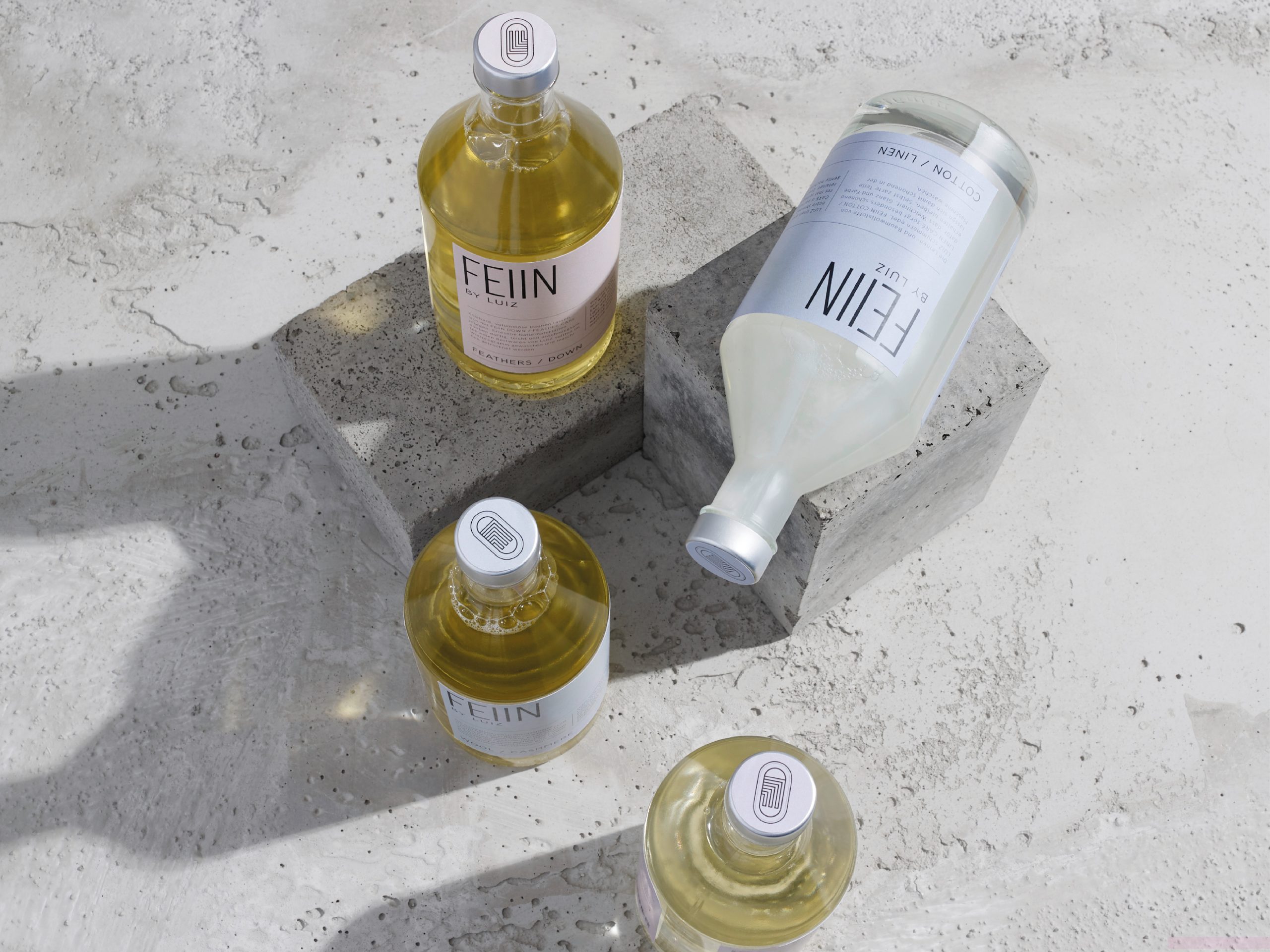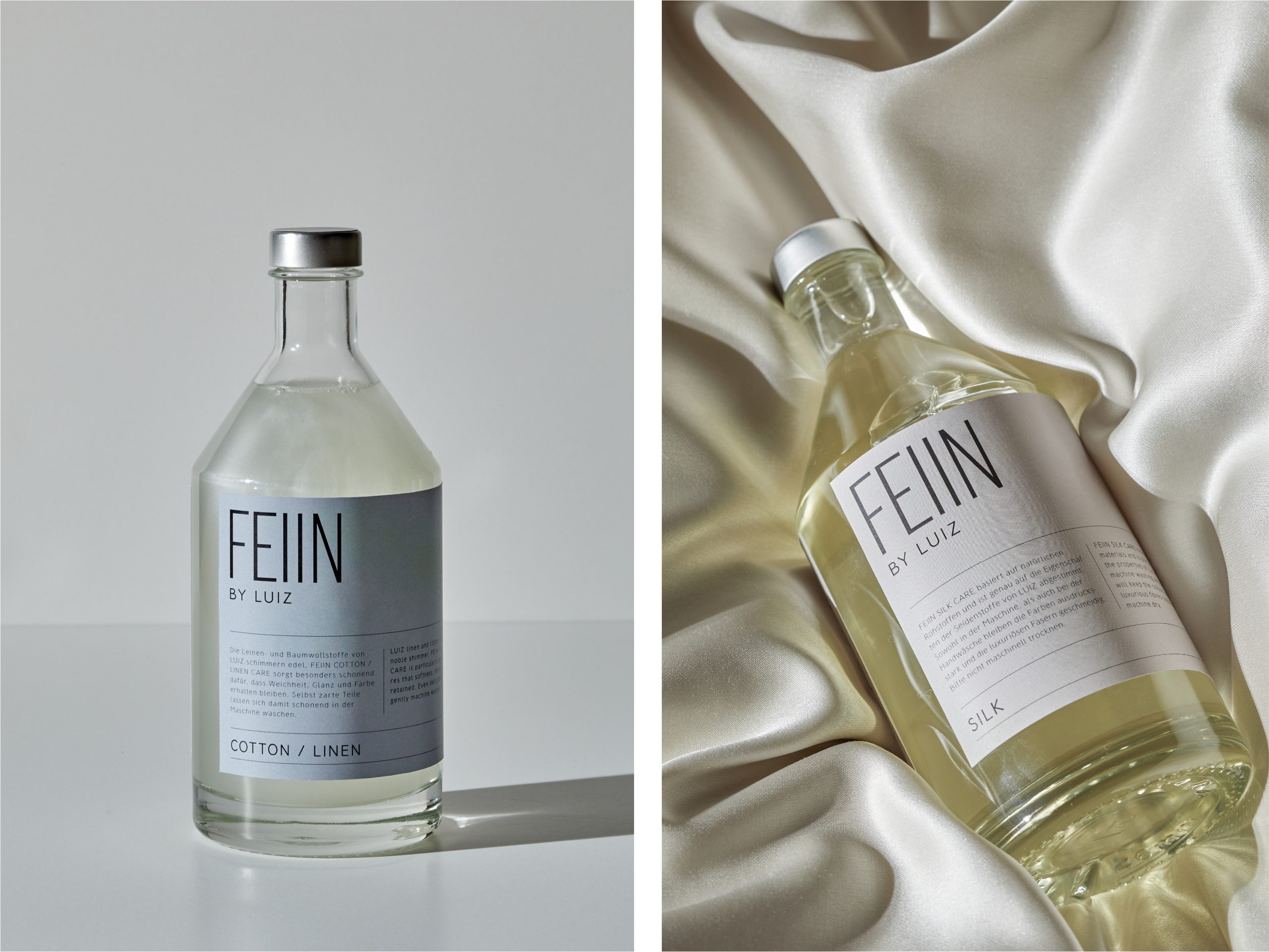 Das ebenfalls von Studio Oeding entworfene elegante Corporate Design der Marke war maßgeblich für das Designkonzept der Pflegeserie „FEIIN by LUIZ“. Die Produktserie ist in vier Sorten passend zu den Materialien der LUIZ Produkte, wie Wolle/Kaschmir, Seide, Daunen/Federn, Baumwolle/Leinen. Auf der kubistischen Glasflasche (10ml, 100 ml und 500ml) findet das Branding inkl. Gebrauchsanweisung Platz. Das Produktdesign spiegelt die Geradlinigkeit und die Eleganz der Marke auf FSC zertifiziertem Papier in pastelligen Naturtönen wider. Die Beschichtung des Etiketts macht es widerstandsfähig für die vielen Waschanwendungen.