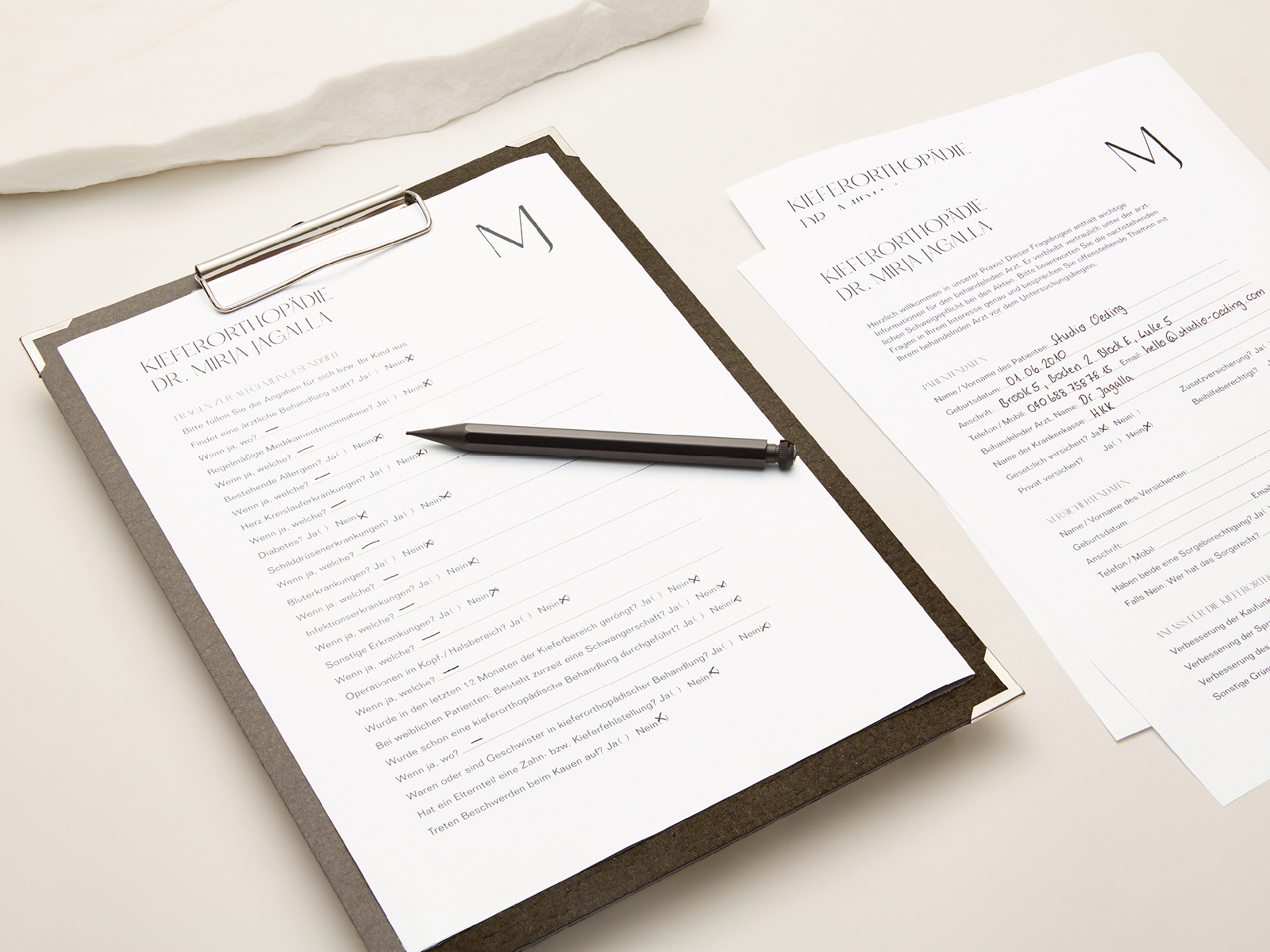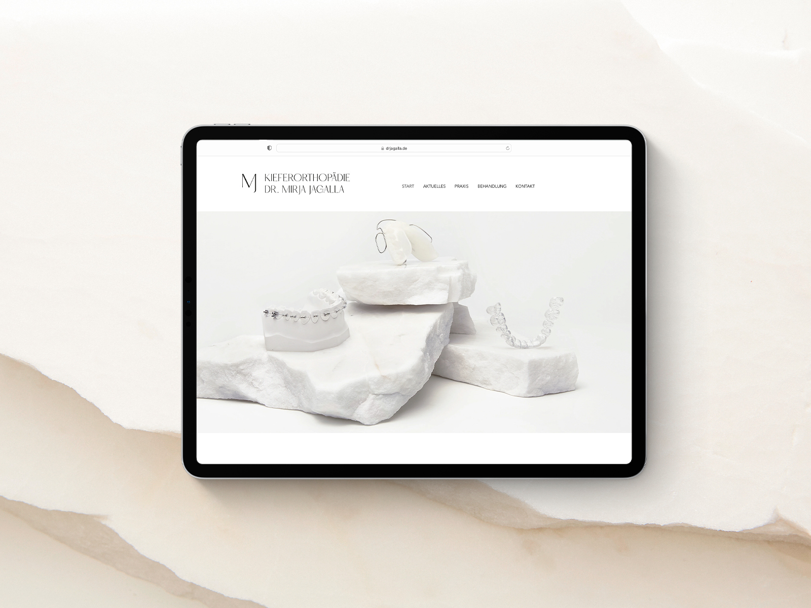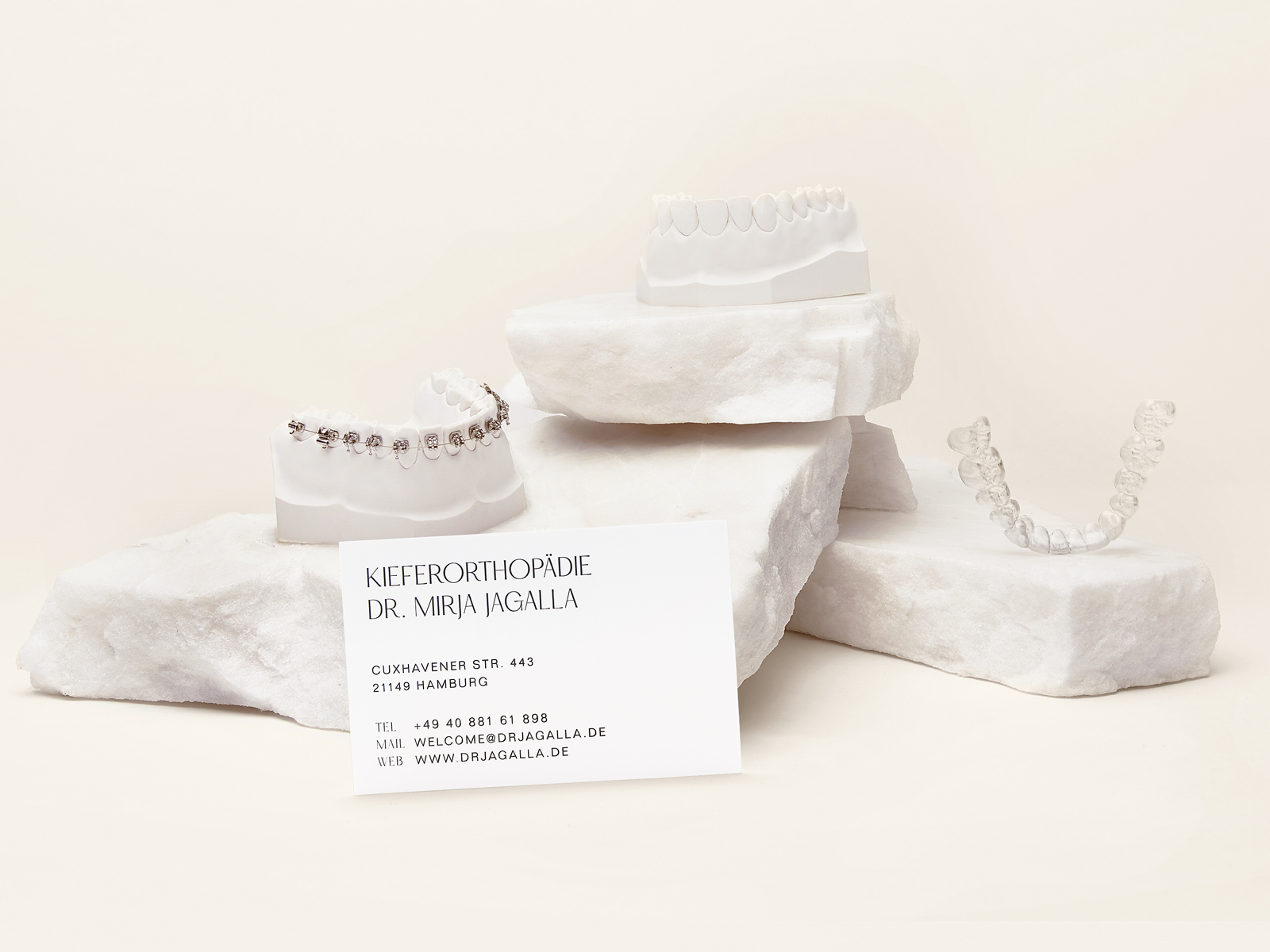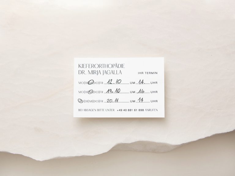 Studio Oeding entwickelte das Corporate Design Konzept. Im Zentrum steht die Verbindung von Expertise und Weiblichkeit. Studio Oeding fokussierte im Designkonzept mit viel Eleganz auf die Ästhetik, die der Treiber in jeder Arbeit von Dr. Mirja Jagalla ist, und betont mit feinen, weicheren Linien die Weiblichkeit der Praxisinhaberin. So entstand in einem reduzierten Farbkonzept und einem eigens entwickeltem Custom Font ein großzügigen Gestaltungskonzept. Im Ergebnis ist das Corporate Design, das Logo Design, das Stationery und das Interface Design überraschend und weicht bewusst vom üblichen Arztpraxen-Designs ab und schafft mit dem unverwechselbaren Design eine Marke mit Wiedererkennung.