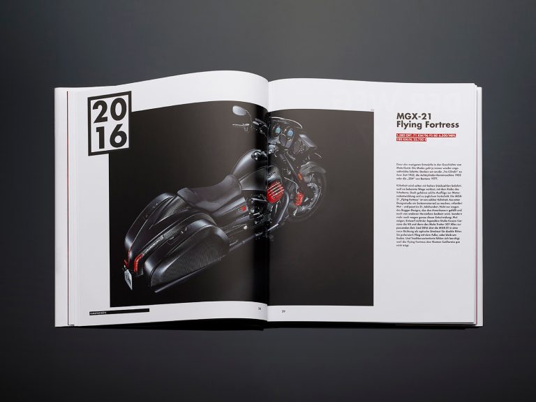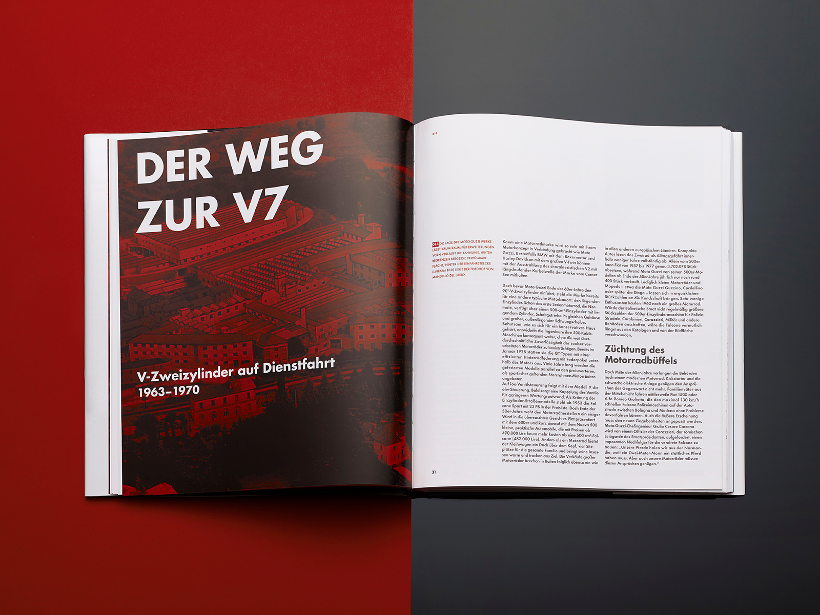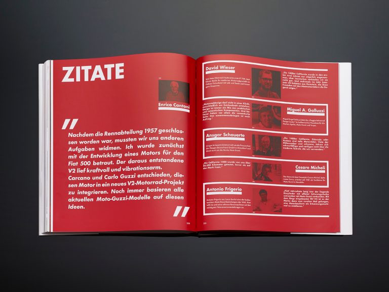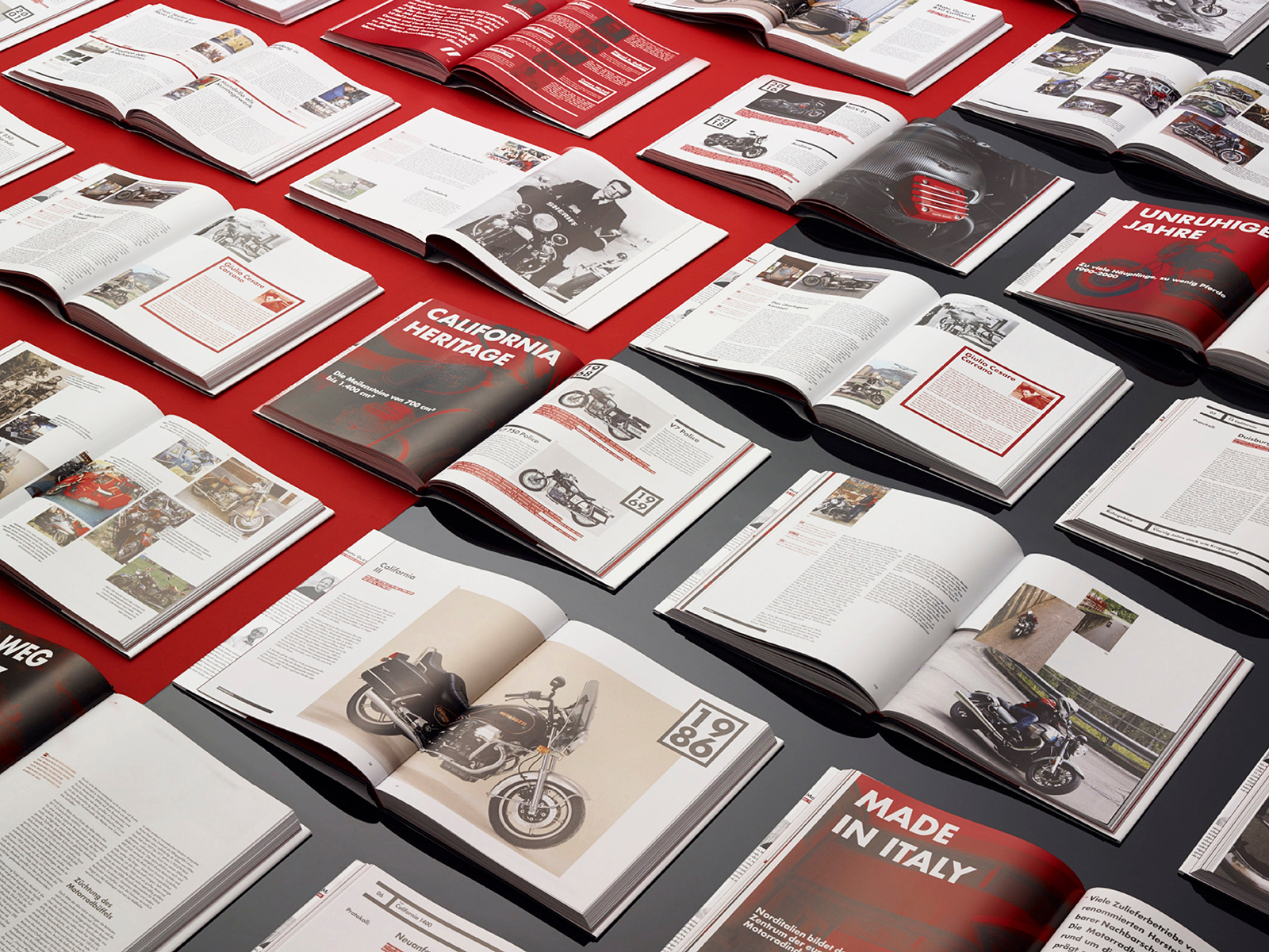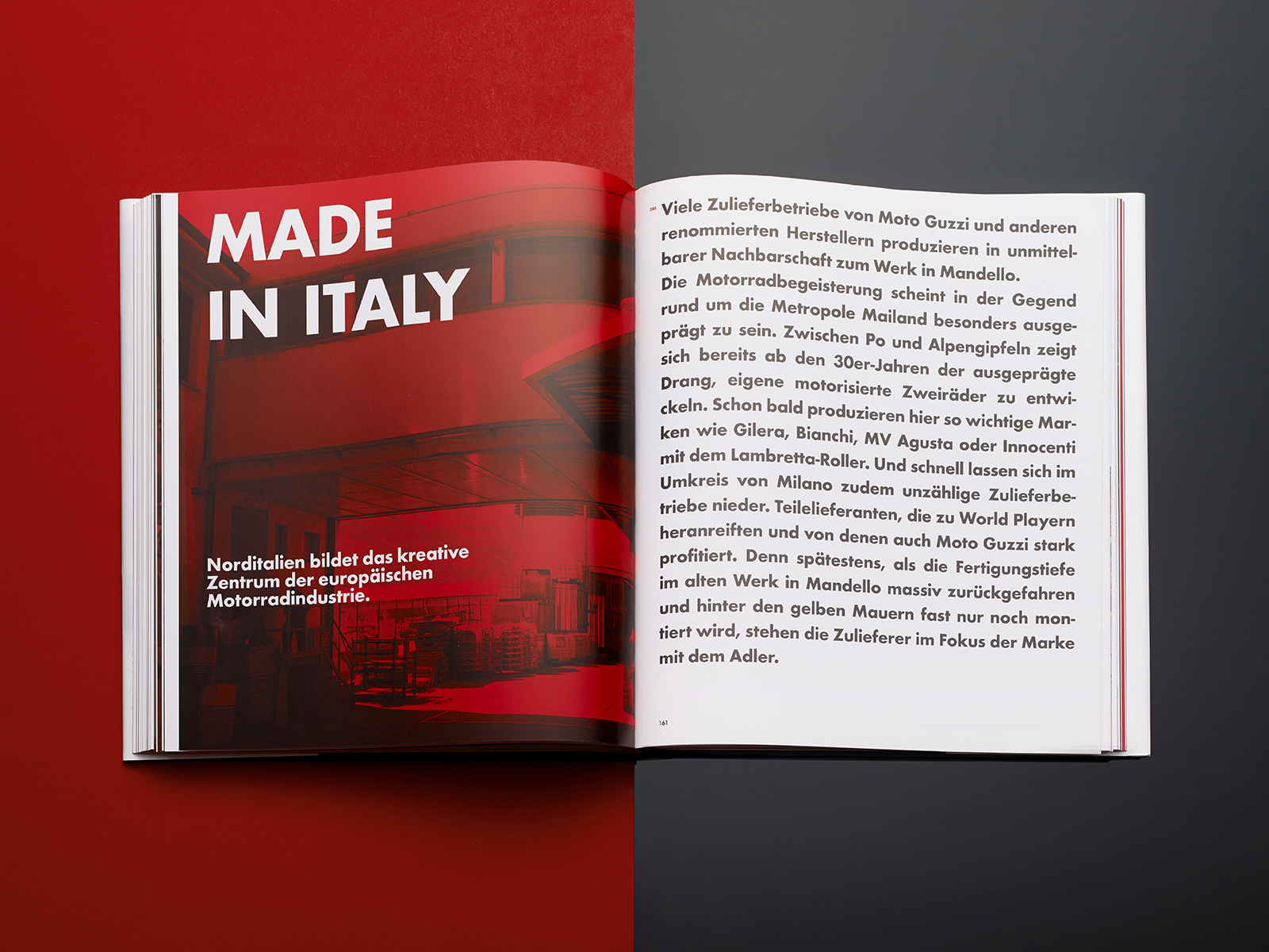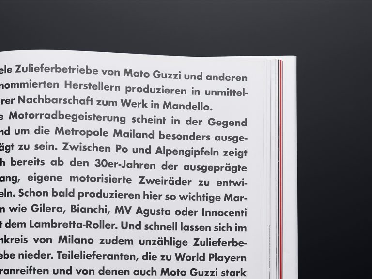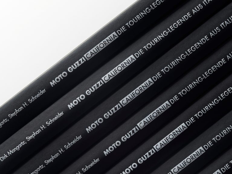 Wir entwickelten das Editorial Design des großformatigen Motorrad-Buchs für Moto Guzzi. Genau wie das Motorrad ist es lässig und rasant, zugleich auch stilvoll und luxuriös. Die perfekte Verbindung aus italienischer Eleganz und amerikanischer Lässigkeit. Dieses erste Standardwerk zur Moto Guzzi California ist zum 50-jährigen Jubiläum beim Delius Klasing Verlag erschienen. Die Motorradjournalisten Dirk Mangartz und Stephan H. Schneider legen damit die komplette Geschichte des italienischen Kultbikes vor.